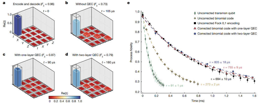 A joint research team from Southern University of Science and Technology of China, Tsinghua University, Fuzhou University, University of Science and Technology of China, and Beijing Academy of Quantum Information Sciences demonstrates a breakthrough QEC experiment, where the break-even point for a discrete-variable qubit is beaten by repetitive error detections and corrections in real time. This work is recently published online in Nature (s41586-023-05784-4) titled “Beating the break-even point with a discrete-variable-encoded logical qubit”.