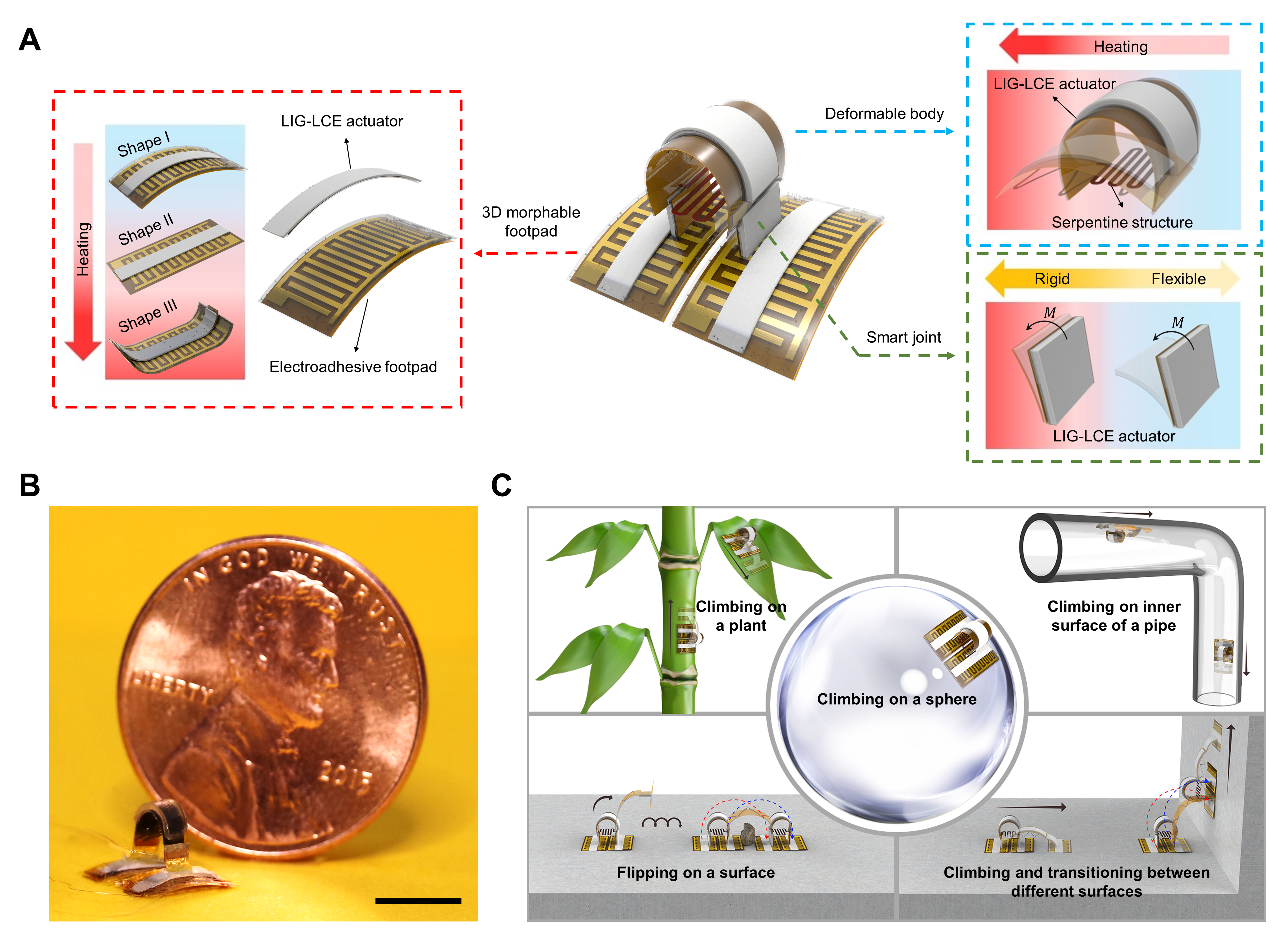 相关研究成果于11月28日在《美国科学院院报》(PNAS)以“一种基于可变形三维驱动器的可在复杂表面攀爬和过渡的微型软体机器人”(A soft microrobot with highly deformable 3D actuators for climbing and transitioning complex surfaces)为题发表。
