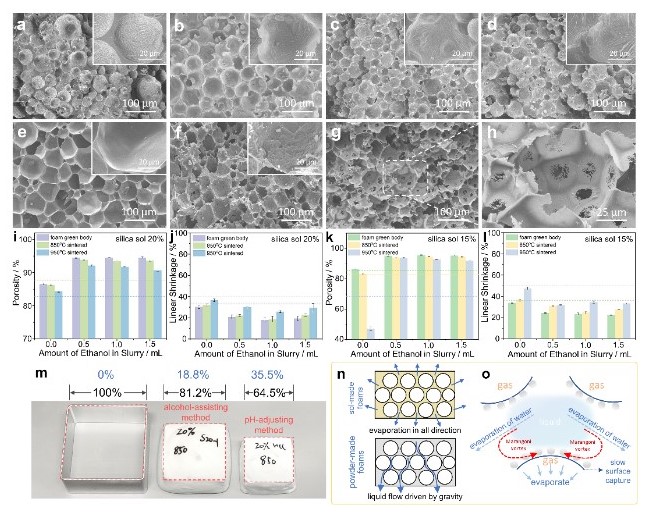 官方入口网12月9日电 泡沫陶瓷作为一种高气孔率的陶瓷,在干燥与烧结过程中的收缩率非常大,一般可超过50%,一直以来是陶瓷界的一大难题,严重影响了泡沫陶瓷器件的制备与使用。2022年11月,乐竞首页材料学院杨金龙教授课题组发现了一种控制泡沫陶瓷干燥与烧结过程收缩率的新方法,利用醇类分子与氧化物表面基团的吸附作用,增强了发泡剂在颗粒表面的吸附量,通过发泡剂分子链的疏水聚集作用,将坯体的收缩率控制在了20%以下。该方法中,醇类分子对体系中表界面的调节作用代替了传统酸碱调节pH值的方法,成为了一种条件温和可控的制备高强度、低收缩泡沫陶瓷材料的新方法。