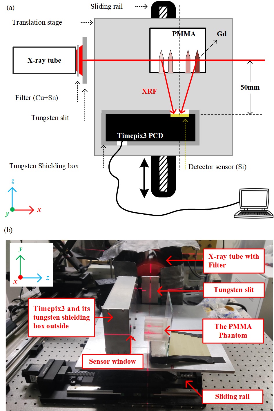 在这项工作中,展示了主要由传统X射线管和Timepix3光子计数探测器组成的X射线荧光康普顿成像系统,开发了一套完整的名为CCFIRM的成像重建算法,来解决X射线荧光康普顿成像中存在的关键算法问题。创新性成果包括有多普勒展宽校正的低能量列表模式最大似然期望最大化算法和基于光子偏振统计分布信息的散射校正算法。该研究给出了钆元素的X射线荧光康普顿成像实验结果,成像结果表明,该课题组所提出的X射线荧光康普顿成像系统可以对35.14mg/ml以上浓度的钆元素实现有效测量。