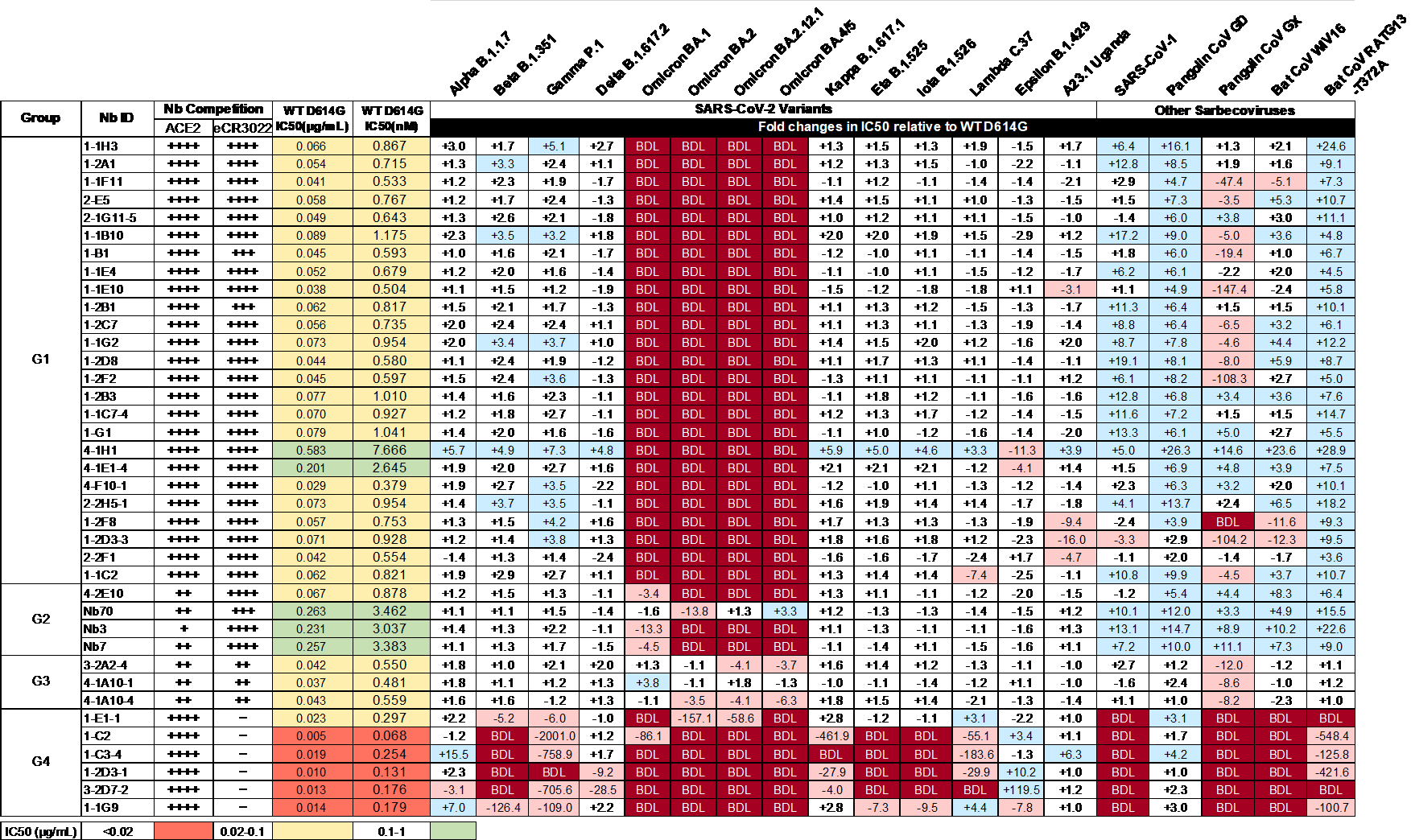 图1.鉴定获得的纳米抗体对SARS-CoV-2变异株和其他sarbecovirus具有广谱中和活性