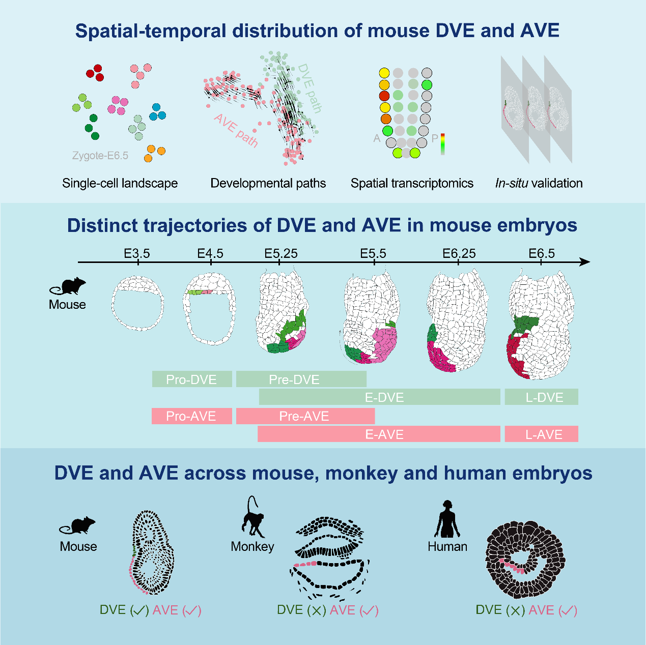 官方入口网1月11日电 前后轴(anterior-posterioraxis,APaxis)建立是哺乳动物胚胎发育中的重要事件,该过程的异常将导致胚胎着床后发育失败与流产。着床后,小鼠胚胎远端内脏内胚层(Distal visceral endoderm, DVE)从远端向胚胎单侧迁移,而后定位于胚胎前侧,形成前内脏内胚层(Anterior visceral endoderm,AVE)。AVE释放的信号分子作用于临近的上胚层(epiblast,EPI),促进其特化具有胚胎体前侧的特征,而对侧EPI由于远离AVE信号而特化形成原条,至此胚胎前后轴正式建立。DVE和AVE作为前后轴形成过程中的关键细胞群体,经典理论倾向于认为它们是细胞迁移过程中同一类细胞的先后两种状态,即DVE是AVE的前体细胞;近年来也有研究提出DVE和AVE是同时存在的两类不同的细胞,且AVE可能来源于非DVE细胞。为此,DVE和AVE具体的起源和特化模式,以及对应的分子调控规律有待进一步揭示。