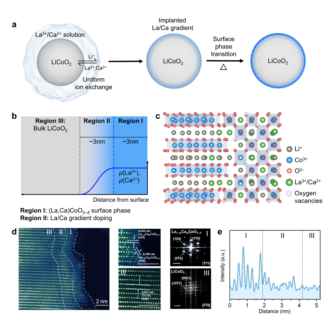 本工作首先讨论了理想中的高稳定性正极表面相的设计原理。在此基础上,以钴酸锂正极为例提出了新的改性策略,利用溶液中的La、Ca离子与表层晶格的Li离子进行交换反应,并辅以后续退火,在正极表面构筑出具有氧空位和8%压应变的钙钛矿纳米相和特殊的表面结构。该策略与金属“渗碳”处理工艺异曲同工,因此在本工作中命名为“渗镧”(Lanthuriztion)。该工艺可控性强,所构建的表面层均匀,成功实现弹性应变的引入和调控,方便大规模制备,是一般的包覆方法难以达到的。通过渗镧工艺处理后的钴酸锂正极具有十分优异的电化学性能。在半电池4.6V下,1C循环500圈后容量保持率为79.8%;高负载软包全电池中,在4.5V下循环500圈后容量保持率为84.4%。该策略也被应用于高镍三元和富锂锰基正极,显著提升了高压循环性能,具有良好的普适性。