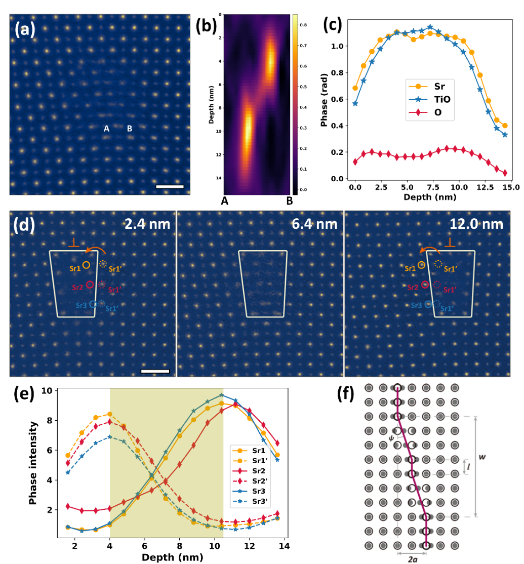 图2. 刃位错的三维可视化。a、刃位错的相位图;标尺长5Å。b、图a中用A-B标记的分裂原子柱相位强度的深度变化。c、Sr、TiO和O原子柱的相位强度的深度分布。d、深度分别为2.4nm、6.4nm和12.0nm的相位图;标尺长5Å。e、图d中标记的原子柱的相位随样品深度的变化。f、位错扭折示意图