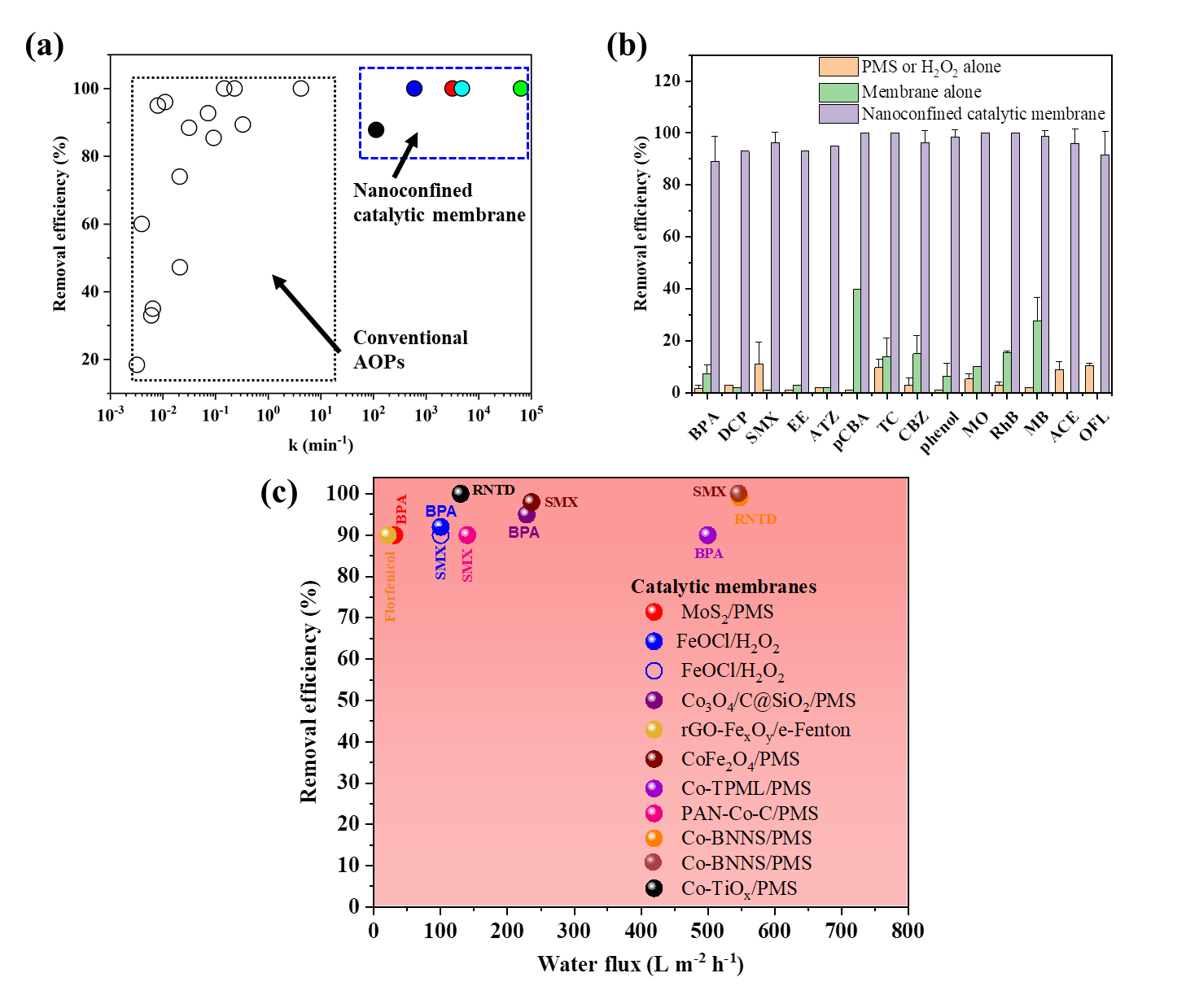 相关工作以“膜法纳米限域催化水处理技术:综述”(Membrane-based nanoconfined heterogeneous catalysis for water purification: A critical review)、“钴功能化石墨相氮化碳纳米片组装的纳米限域催化膜用于快速降解污染物”(Nanoconfined catalytic membranes assembled by cobalt-functionalized graphitic carbon nitride nanosheets for rapid degradation of pollutants)、“膜孔内埃米尺度限域催化实现水净化”(Angstrom-confined catalytic water purification within Co-TiOxlaminar membrane nanochannels)、“超高通量原位功能化的氮化硼膜用于限域催化”(Ultrahigh permeance functionalised boron nitride membrane for nanoconfined heterogeneous catalysis)为题,分别发表在《水研究》(Water Research)、《应用催化B:环境》(Applied Catalysis B: Environmental)、《自然·通讯》(Nature Communications)、《化学·催化》(Chem Catalysis)上。