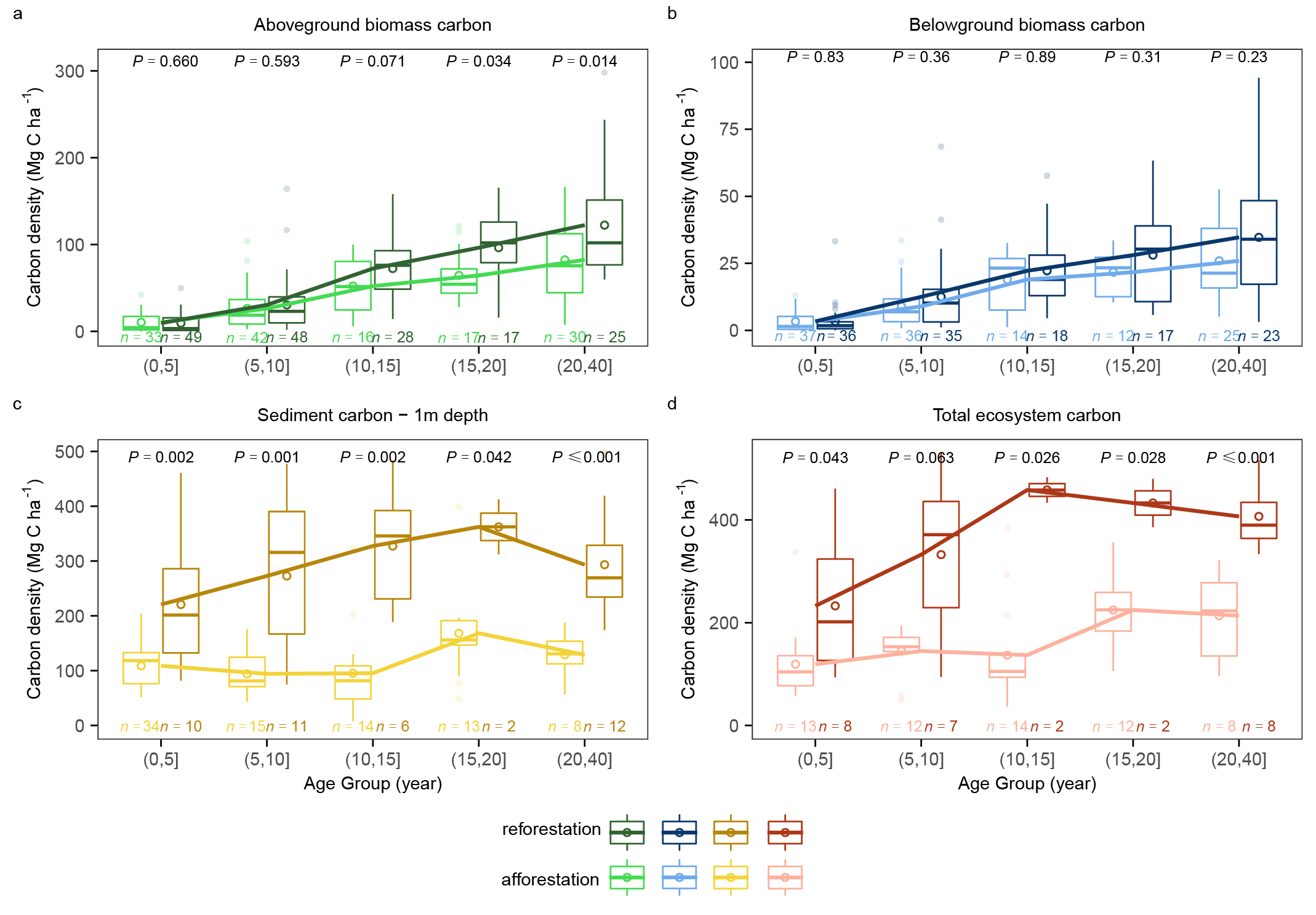 本研究通过对全球众多案例和文献数据的综合分析发现,在已破坏的红树林生境(如废弃鱼塘、受严重损害的红树林林地等)再造林相比于红树林造林本身可以带来更高的碳固存效益,与此同时利用破损林地再造林还可规避大面积恢复红树林对滩涂(鸟类等珍稀动物的觅食生境)的负面影响,因此在未来设计基于自然的解决方案时,全球红树林再造林应当成为优先考虑的恢复模式。研究结果可为双碳背景下制定红树林修复政策和修复工程设计以及红树林生物多样性保护等方面提供科学依据。