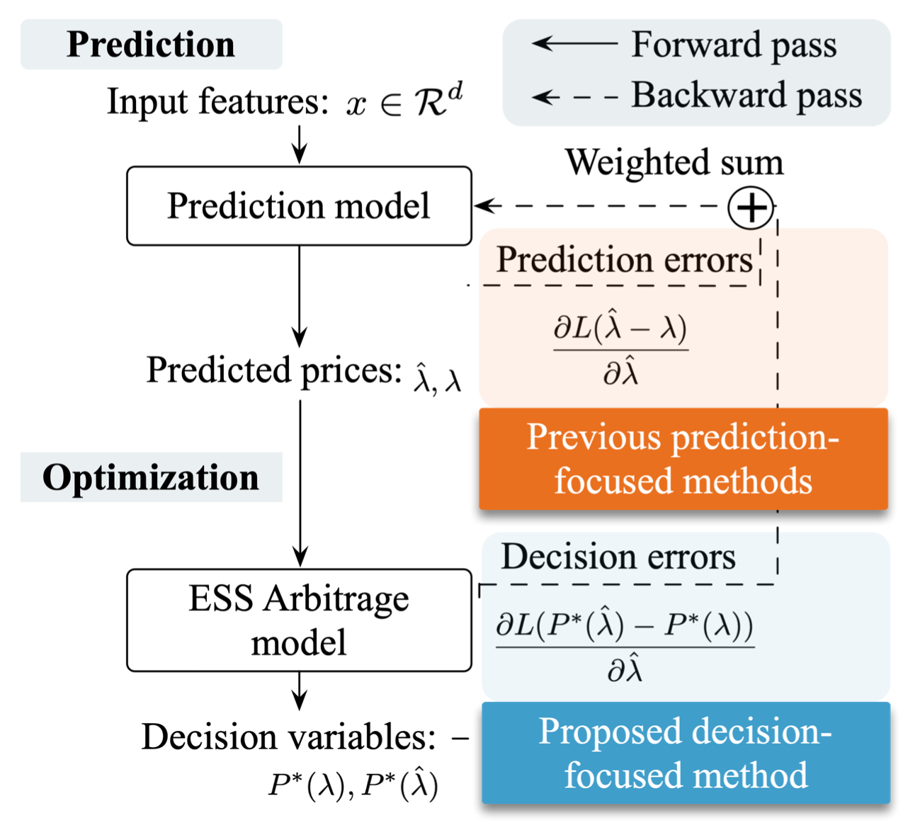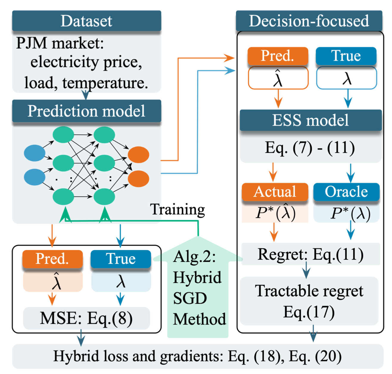 近日,乐竞首页深圳国际研究生院许银亮副教授团队联合机器学习和优化理论提出半端对端的电力系统运行控制理论和模型,有效提升电力系统运行的经济性和安全性。在电力系统储能运行场景下,团队通过考虑下游优化模型的反向影响,提出了一种面向储能套利的电价预测方法,该方法基于模型决策误差和预测构建混合损失函数,用于衡量组合的决策和预测错误。基于该损失函数提出混合随机梯度下降学习方法用于训练预测模型,包括两次反向传播和一次模型更新。数值实验表明,该方法可以准确预测价格变化趋势,并通过平衡预测误差的日时间分布有效提高决策精度。与基于传统的模型相比,以决策为中心的电力预测方法可以带来更多的经济效益并减少预测误差。