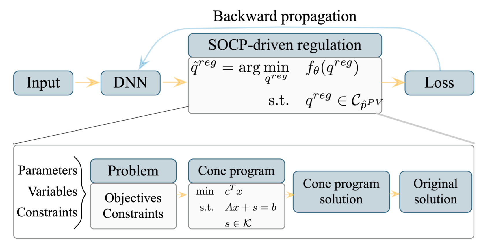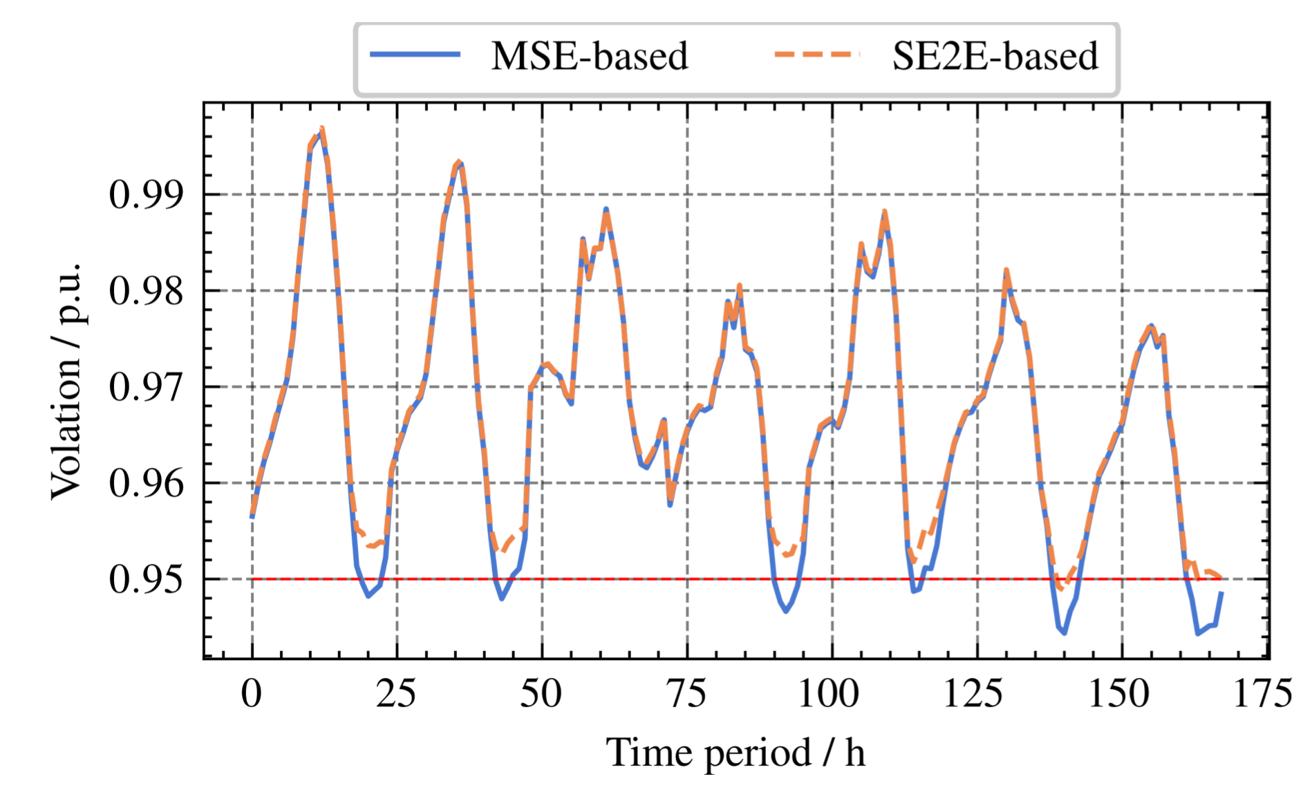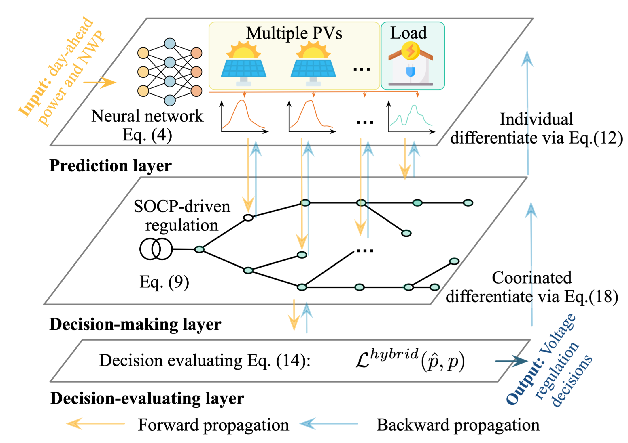 在电力系统调压场景下,团队通过连接基于神经网络驱动的预测模型和二阶锥规划的调压模型,提出了一种用于电压调节的安全感知半端到端协调决策模型以实现提高电力系统决策质量,其中提出综合损失函数评估决策的经济性和安全意识。团队还提出混合随机梯度下降学习算法以协同微分的方式训练多个光伏/负荷预测模型。数值实验证明,与传统的预测和优化模型相比,所提出的决策模型在经济场景中实现了具有较低损耗的调节经济性,以及在安全感知场景中具有较低电压越限率。