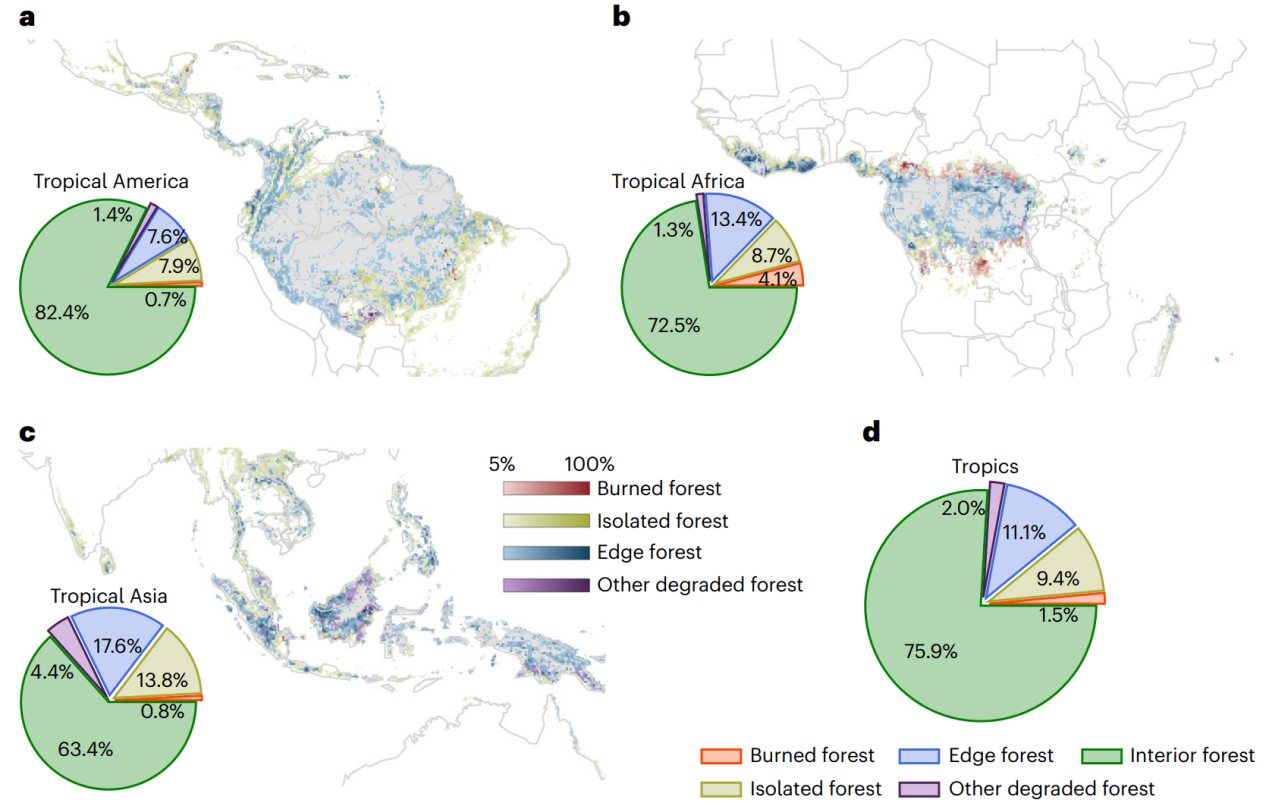 乐竞首页地学系李伟副教授课题组联合国内外多所研究机构,利用高分辨率卫星观测数据,针对上述问题在热带雨林地区展开研究。研究首先识别了四类退化的热带雨林:被火烧过的森林、小斑块森林、边缘森林和其他退化森林(图1),分析了热带雨林退化导致的生物物理和生物地球化学效应,量化了1990-2010年间人为导致的热带雨林退化的生物物理和生物地球化学效应。研究发现,2010年24.1%的热带雨林发生了退化;发生森林退化区域的地表温度相比于没有发生退化的内部森林高了0.78±0.88°C,对整个热带区域而言,热带雨林退化造成了地表平均升温0.022±0.014°C;热带雨林退化造成的总碳亏缺达到了6.1±2.0PgC,带来的热带区域等效升温为0.026±0.013°C。热带雨林退化导致的生物物理及生物地球化学增温效应十分接近。1990-2010年,人为导致的热带雨林退化带来的白天地表温度升温为0.018±0.008°C,带来的碳亏缺为2.3±0.8PgC,与同期森林砍伐的影响量级相当。