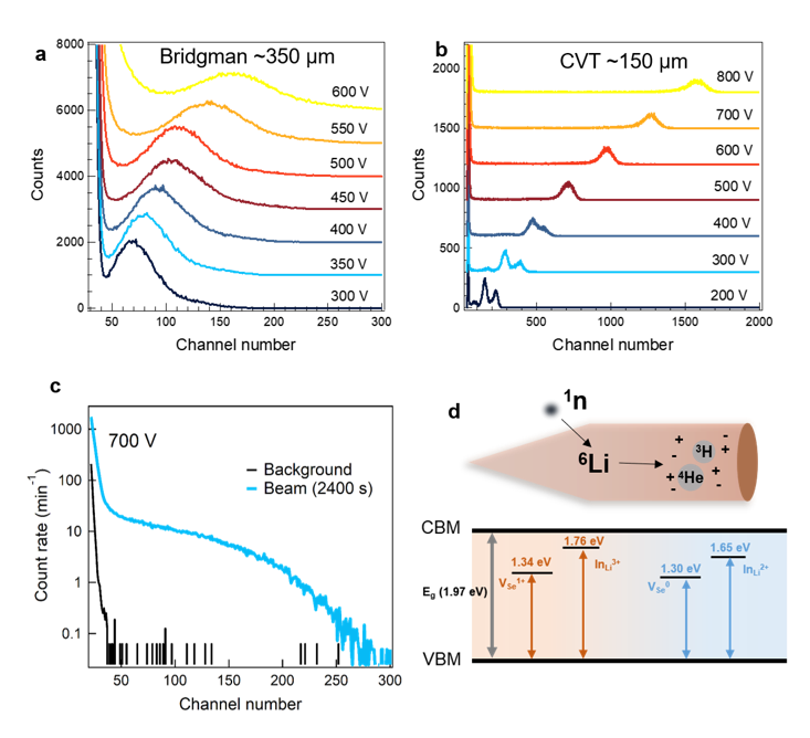 针对上述关键问题,乐竞首页材料学院李千副教授课题组联合工程物理系杨祎罡教授课题组等团队开发了一种大尺寸、高质量LiInP2Se6单晶的生长方法,通过Bridgman法制备出厘米量级的块体单晶,并实现了热中子探测原型器件的验证。研究中,通过调控Bridgman法生长工艺(过热温度、结晶温度梯度、坩埚结构设计和下降速度等)首次成功制备出直径达12mm、厘米级长度的大尺寸块体单晶(图1a)。扫描透射电镜(图1b)和劳厄相机(图1c)测试结果表明Bridgman法制备所得晶体具有优良的单晶性和均匀性。光学二次谐波产生测试(SHG,图1d)进一步揭示了Bridgman法生长应力的分布和影响。Bridgman法所得LiInP2Se6单晶对热中子具有鲁棒的辐射探测响应(图2c),显示其作为实用化固态中子探测器的潜力,此外通过alpha粒子轰击实验证实了单晶良好的耐辐照能力。对比CVT和Bridgman法所得单晶的alpha粒子响应数据可知(图2a、b),目前在探测性能方面CVT法所得单晶质量更优。缺陷的存在和种类会影响载流子信息收集,最终反映为对中子探测性能的影响。进一步的实验和理论计算结果表明Bridgman法对应的晶体生长环境更倾向于硒的缺失和铟的过量,易形成VSe0和InLi2+两种更深能级的缺陷(图2d)。缺陷能级越深,对载流子产生束缚作用越强,不利于载流子迁移,从而影响探测性能,缺陷机制的研究为进一步优化Bridgman单晶质量提供了重要依据。该工作开发了一种具有可控的、可放大性的LiInP2Se6块体单晶制备路线,进一步厘清了其晶体结构、电学性能和缺陷机制的关联,并验证了原型LiInP2Se6单晶探测器的实用化中子探测能力,从而对直接型中子探测材料及器件的研究进程作出重要推动。