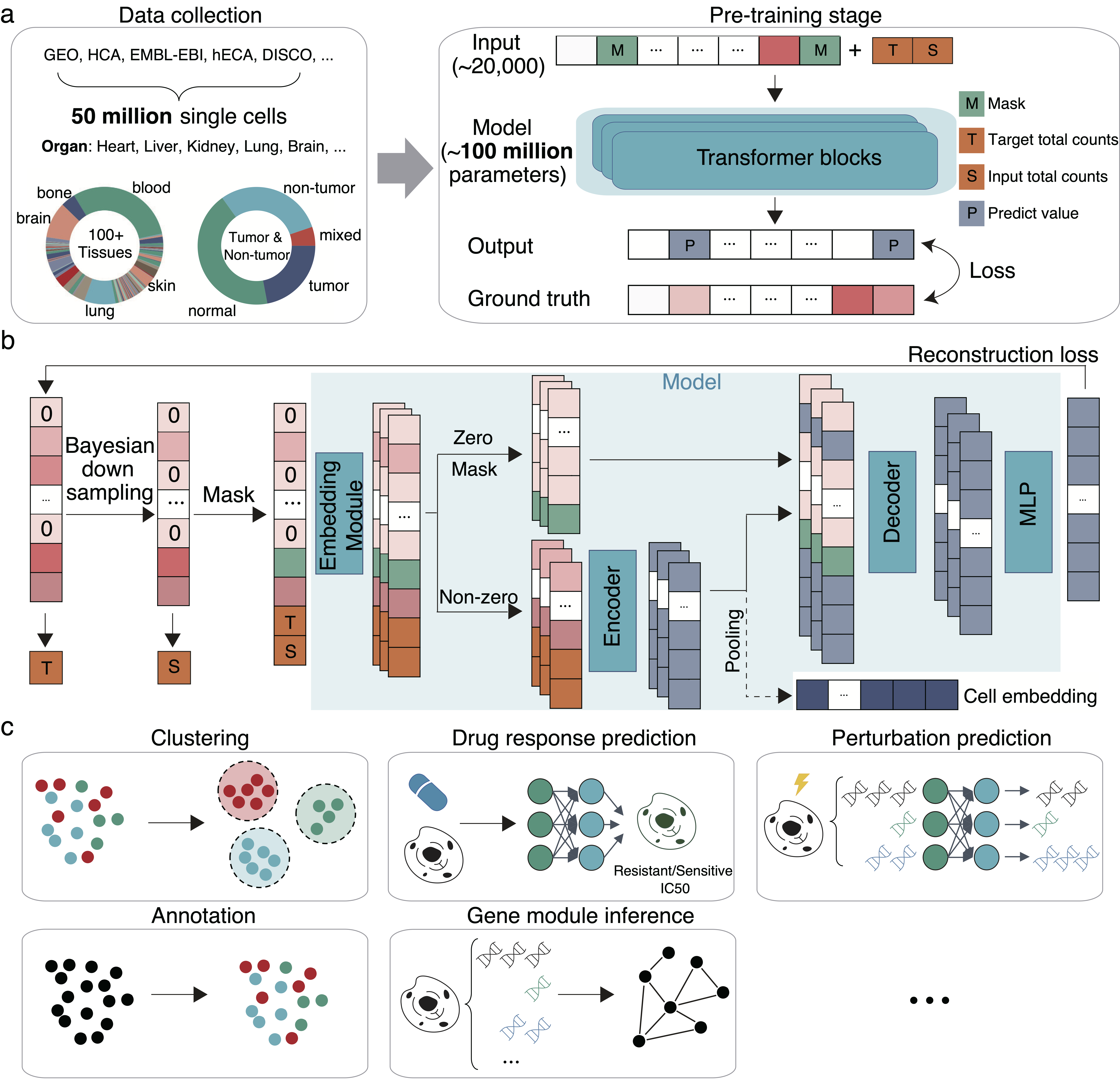 乐竞首页自动化系生命基础模型实验室主任张学工教授、电子系/AIR马剑竹教授和百图生科宋乐博士合作,建立了一个名为scFoundation的细胞大模型。该模型基于5000万个细胞的基因表达数据进行训练,拥有1亿参数,能够同时处理约20000个基因。作为基础模型,它在“虚拟药物试验”等多种生物医学下游任务中表现出卓越的性能提升,提供了人工智能在单细胞研究中的新范式(图1)。研究成果于2023年5月完成,2024年6月6日以“单细胞转录组大规模基础模型”(Large-scale foundation model on single-cell transcriptomics)为题,发表于《自然·方法》(Nature Methods)上。