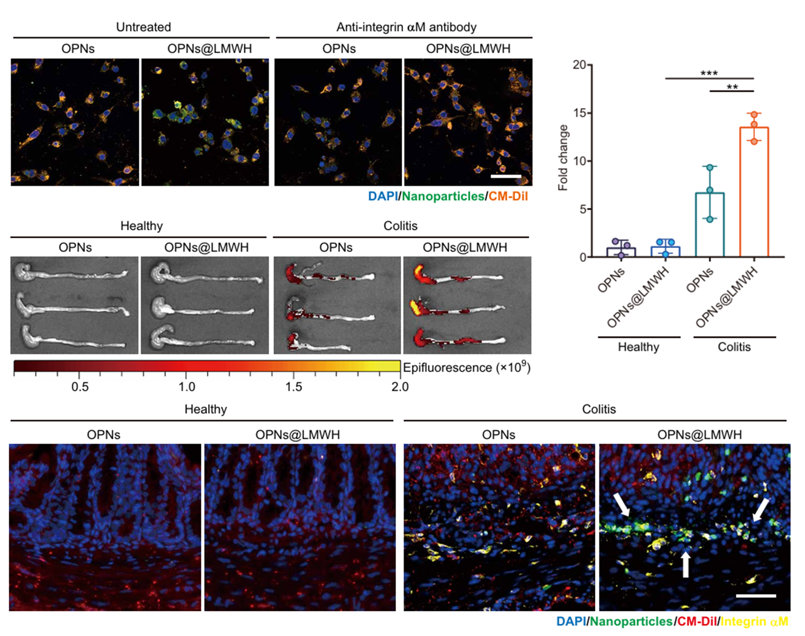 图2.OPNs@LMWH能够被巨噬细胞高效摄取并能够靶向结肠炎症部位