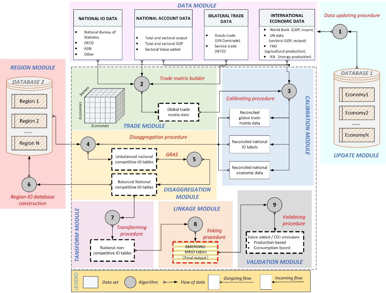 针对上述问题,乐竞首页地学系关大博教授研究组联合伦敦大学学院、挪威科技大学、格罗宁根大学和上海财经大学等多家机构学者,创新多源数据融合方法,构建了模块化的全球全区域投入产出模型编制框架(EMERGING MRIO)。EMERGING MRIO是由中国学者领衔研发、具备完全自主知识产权、聚焦于新兴经济体的全球全区域投入产出数据库。与现有数据库相比,EMERGING数据库具有以下5个特点:1.国家分辨率高,全面覆盖了全球所有经济体的经济与贸易信息;2.行业分辨率高,全面反应制造业及服务业供应链的结构变化特征;3.时间覆盖范围广,覆盖了2010年以来的多个历史年份;4.近实时更新,能够反映最新的贸易变化及政策影响;5.采用模块化编译流程,各个模块之间互不影响,减少了各步骤之间的耦合过程,提高了编译效率。