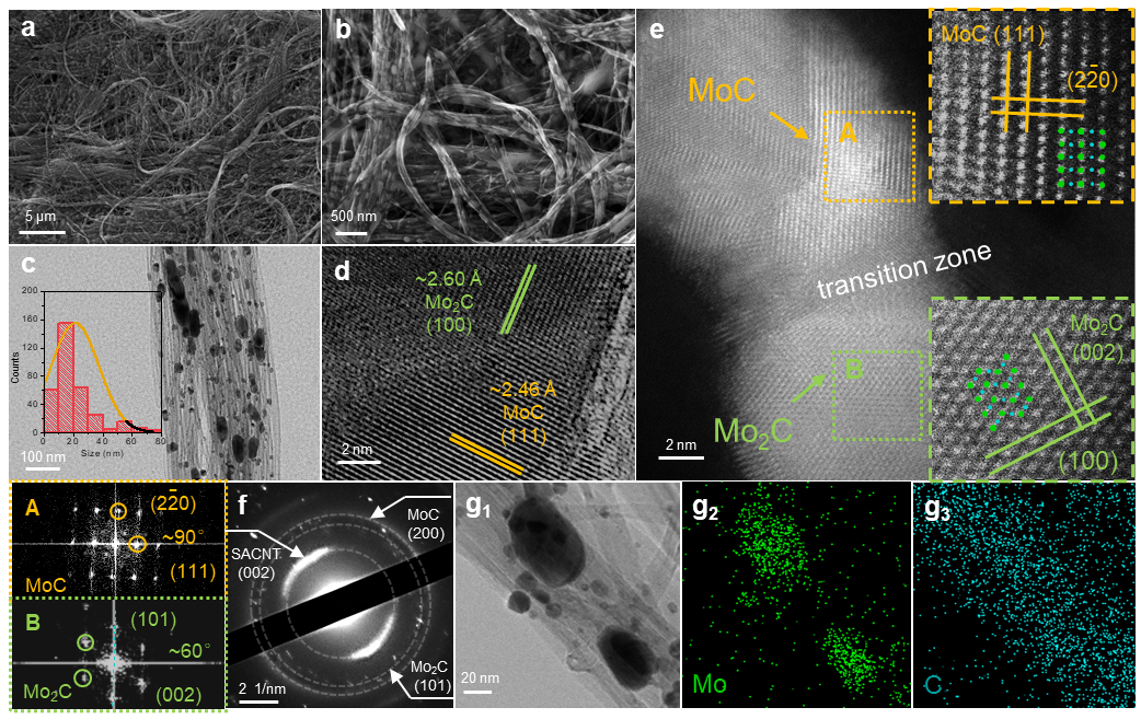 图2. Mo2C/MoC/CNT薄膜的电子显微镜表征