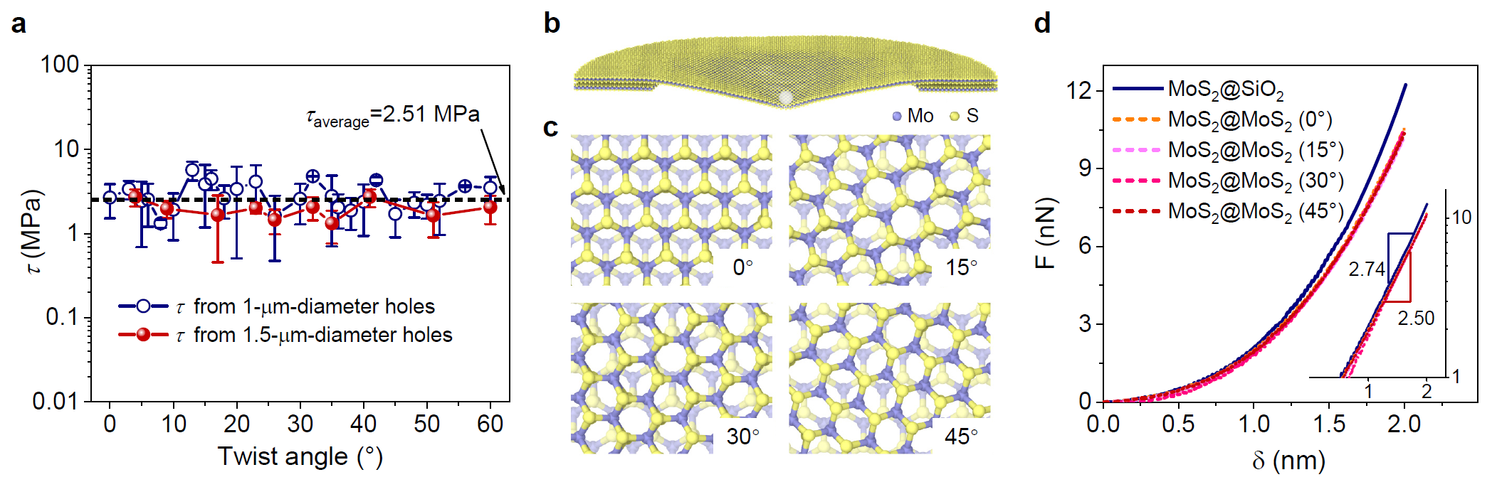 利用AFM探针对上层悬空MoS2施加应力,测试其应变(图2a)。采用固定边界条件下简单的应力-应变关系,可得到了上层MoS2的名义弹性模量。结果发现,上层MoS2的名义弹性模量与层间扭转角度无关,但其数值相比直接转移在SiO2/Si基底上的样品小15%左右(图2c)。这一事实说明,MoS2较弱的层间作用导致上层MoS2弹性模量测试值低于真实值。考虑到弹性模量是材料的本征性质,不应与约束条件或测试方法有依赖关系,本研究提出了剪切边界模型,用以描述上层MoS2在纳米压痕实验中的受力情况。该模型假设:在悬空区域,上层MoS2仅受到探针施加的弹性应力,而在有支撑的区域,上层MoS2受到平行与基底的拉应力和层间剪切应力的作用(图3d)。通过模型分析,本研究建立了全新的剪切边界模型,并获得了载荷-下压位移的近似公式,该公式同时考虑了二维材料的预应力、弹性模量和层间剪切的贡献,比固定边界条件模型更具普适性。将实测数据通过最小二乘法拟合该公式,即可获得MoS2的层间剪切应力。通过对30个不同扭转角度的150余个样品测试分析,研究发现其层间剪切应力与扭转角度之间无明显的依赖关系(图4a)。分子动力学模拟纳米压痕过程也给出相同的结论。这一现象是由于二维材料的层间作用是长程平均后的范德华力,因此克服了扭转晶格结构带来的影响,不具有扭转角度的依赖性。