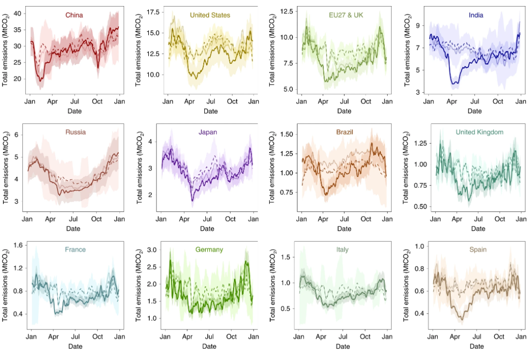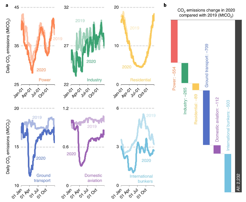 研究指出,日尺度二氧化碳排放估算结果能够体现季节性、工作日、天气和新冠疫情对排放的影响。研究发现,较2019年,2020年全球二氧化碳排放减少了6.3%。2020年上半年,受世界范围内的出行禁令或“封城”等疫情限制性措施措施(lockdown)影响,经济活动受阻而排放下降,对交通部门影响最大。随着2020年4月下旬经济活动的逐渐复苏,二氧化碳日排放反弹,接近至2019年水平。2020年末的第二波疫情导致西方国家的日排放下降,但下降程度较第一波疫情轻微。研究强调,即便是疫情造成的减排,也只能基本达到《巴黎协定》升温1.5摄氏度目标的年平均减排要求,表明实现全球碳中和的目标任重道远。