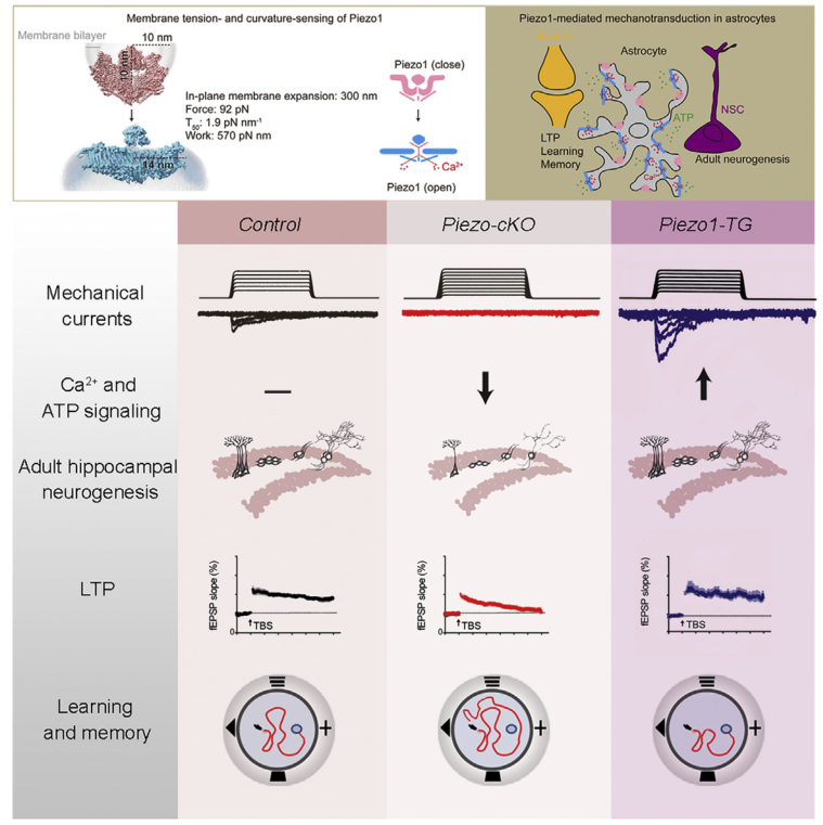 该研究于8月12日发表在《神经元》(Neuron)期刊上,标题为“Piezo1介导星形胶质细胞的机械信号传导并调节海马成体神经发生和认知功能”(Astrocytic Piezo1-mediated mechanotransduction determines adult neurogenesis and cognitive functions)。
