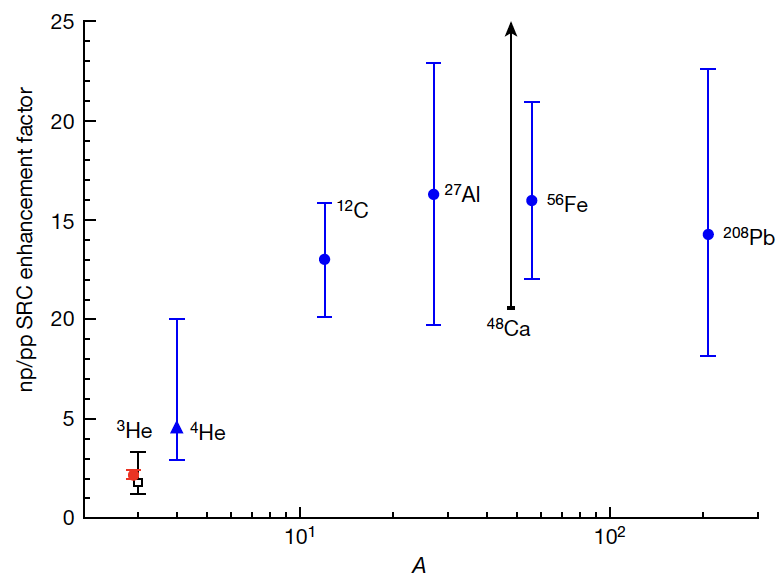 由于核子间的短程吸引力在核子同位旋为零的时候最强,质子(p)和中子(n)更加容易形成SRC对。多组美国杰斐逊实验室(Jefferson Lab)实验通过高能电子碰撞原子核来拆开SRC核子对,并测量末态反向运动的高能核子的种类,发现在碳核中形成np-SRC对的概率比形成pp-SRC对和nn-SRC对的概率高出20倍,而且在更重的原子核中都有类似的性质。这些结果表明对原子核结构的理论表述可以在原有的近似模型基础上加上一个对适用于所有原子核的SRC修正。但是由于直接测量末态反向核子的实验难度极大,统计数小,而且也需要复杂的理论修正,所以实验结果的误差往往极大,造成这种共通的SRC修正可靠度不高。