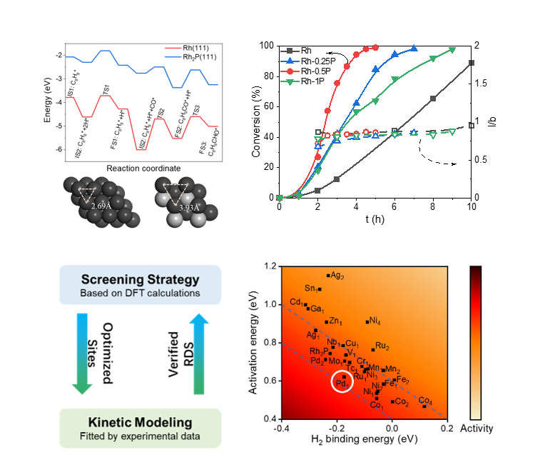 近年来,王铁峰团队合成了一系列性能优异的新型Rh基无机磷化物氢甲酰化反应催化剂,提出了非均相氢甲酰化催化剂的活性描述符,为高效筛选催化剂奠定了基础;基于反应机理和动力学研究,实现了催化性能优化。团队进一步将无机金属磷化物催化剂拓展用于乙酰丙酸乙酯加氢制戊内酯和醇类氨化反应体系,均获得了优异的催化性能。