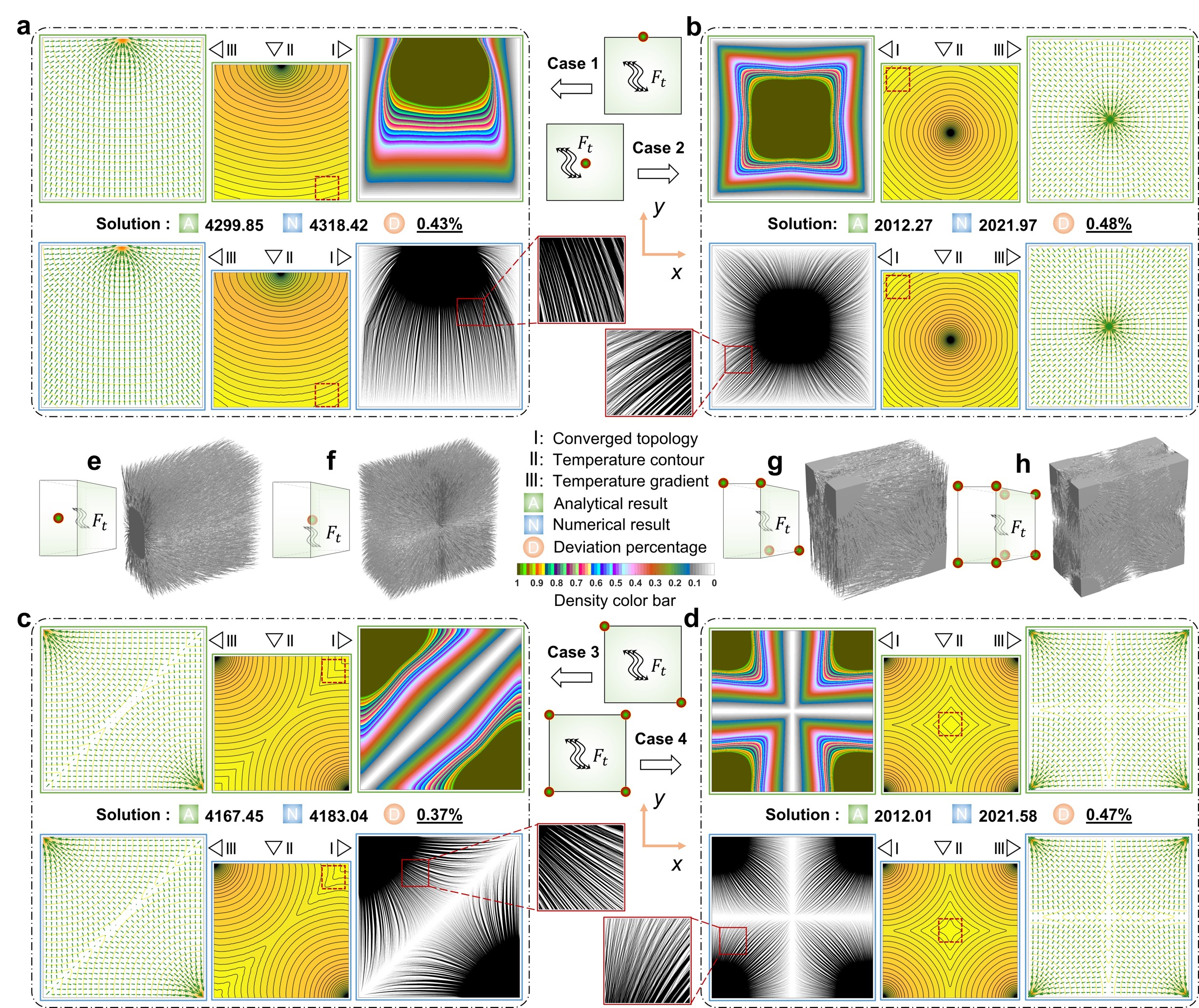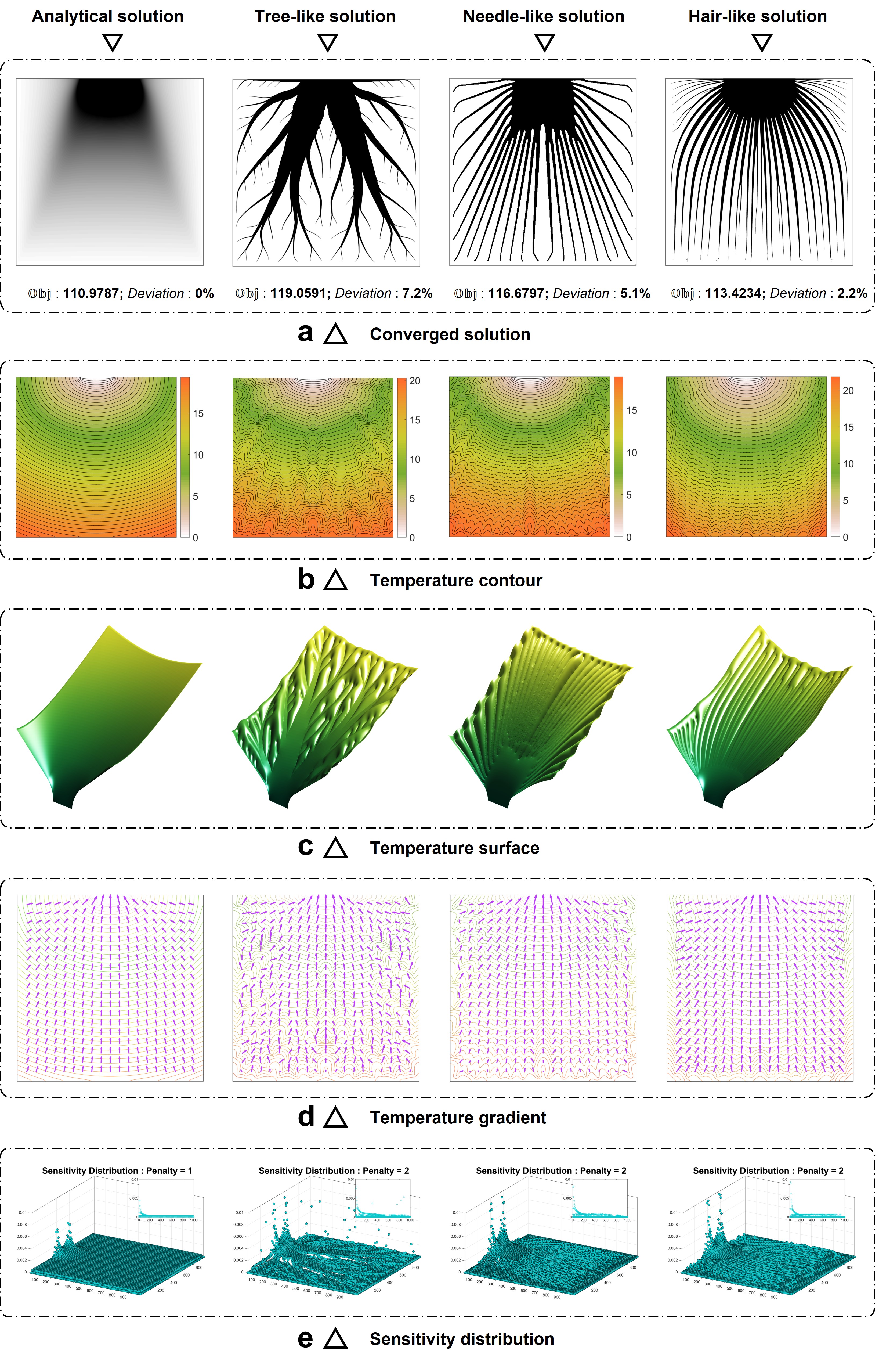 在探索最优传热结构形态的漫漫历史征途中,国内外许多学者从不同角度提出过不同的观点,但都缺乏有力的实证。文献中大多数启发式工作认为树状结构为传热最优结构形态。丹麦西格蒙德(Sigmund)院士团队证明了树状结构形态为局部最优解,并提出了针状结构形态为全局最优解的观点。然而杜建镔课题组研究团队证明了该观点存在错误和不足。研究人员从基础理论出发,开创性地提出了基于常微分方程演化的水平集变密度结构拓扑优化方法,从数值优化的角度给出了正确的最优结构形态:发状形态。经过与解析全局最优解进行对比,发状解目标函数及物理特征与全局最优解相一致。研究人员进行了解析推导、数值仿真和物理实验工作,论证形成闭环,论据充分,结论正确,修正了文献中的传统结论,进一步更新了人们对传热结构设计的认知。
