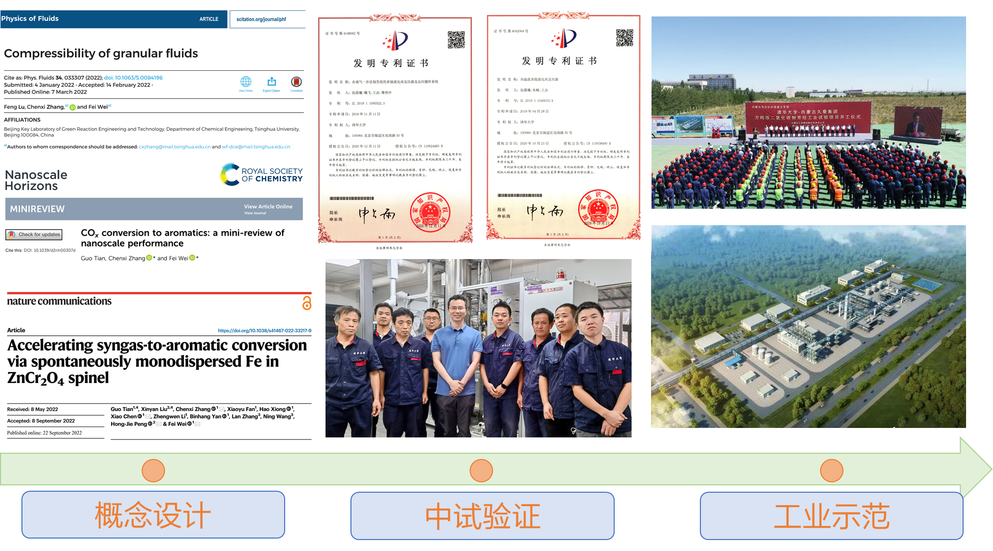 在“碳达峰-碳中和”目标下,巨量CO2的高效利用与分散可再生能源的储运消纳是新能源范式的瓶颈。化工系魏飞-张晨曦团队提出CO2加氢绿色转化路线,以含芳环烃类作为产物,以工业排放的CO2作为碳源、配合光伏电解水产生的绿H2生产高能量密度航空燃料与高附加值芳烃。不仅可有效地将CO2转化为具有绿色屏障的高能量密度燃料以缓解全球航空业的碳减排压力,或提供绿色化学品合成新路径;还解决了可再生电力和绿氢的大规模储存与消纳问题。为实现CO2加氢绿色转化,首先要求构造兼具高产品选择性和深度CO2加氢的催化体系;其次,理解气固相结构特征是设计高压加氢流化床的核心;在此基础上,百吨级的中试验证是技术从实验室走向工业化的关键一步。