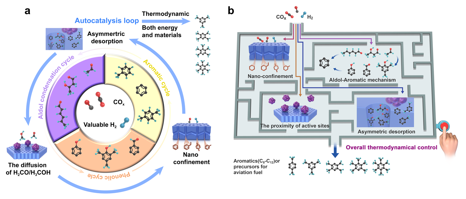 此外,该团队对CO/CO2加氢绿色转化的反应路径设计、催化剂体系构造以及反应机理探究进行了综述与展望。从耦合催化体系与生物代谢系统的相似性出发,阐述以含芳环为产物反应过程的热力学优势为类代谢过程提供方向指引,尖晶石与分子筛形成异质结具有双向耦合效应,促进关键中间产物甲醛以及产物芳烃的非对称吸脱附,这是该催化体系获得超高芳烃选择性的关键。相关成果以“COx Conversion to Aromatics: A mini-review of nanoscale performance”(COx制芳烃:纳米尺度的微综述)为题发表于《纳尺度·视野》(Nanoscale Horizons)期刊上。