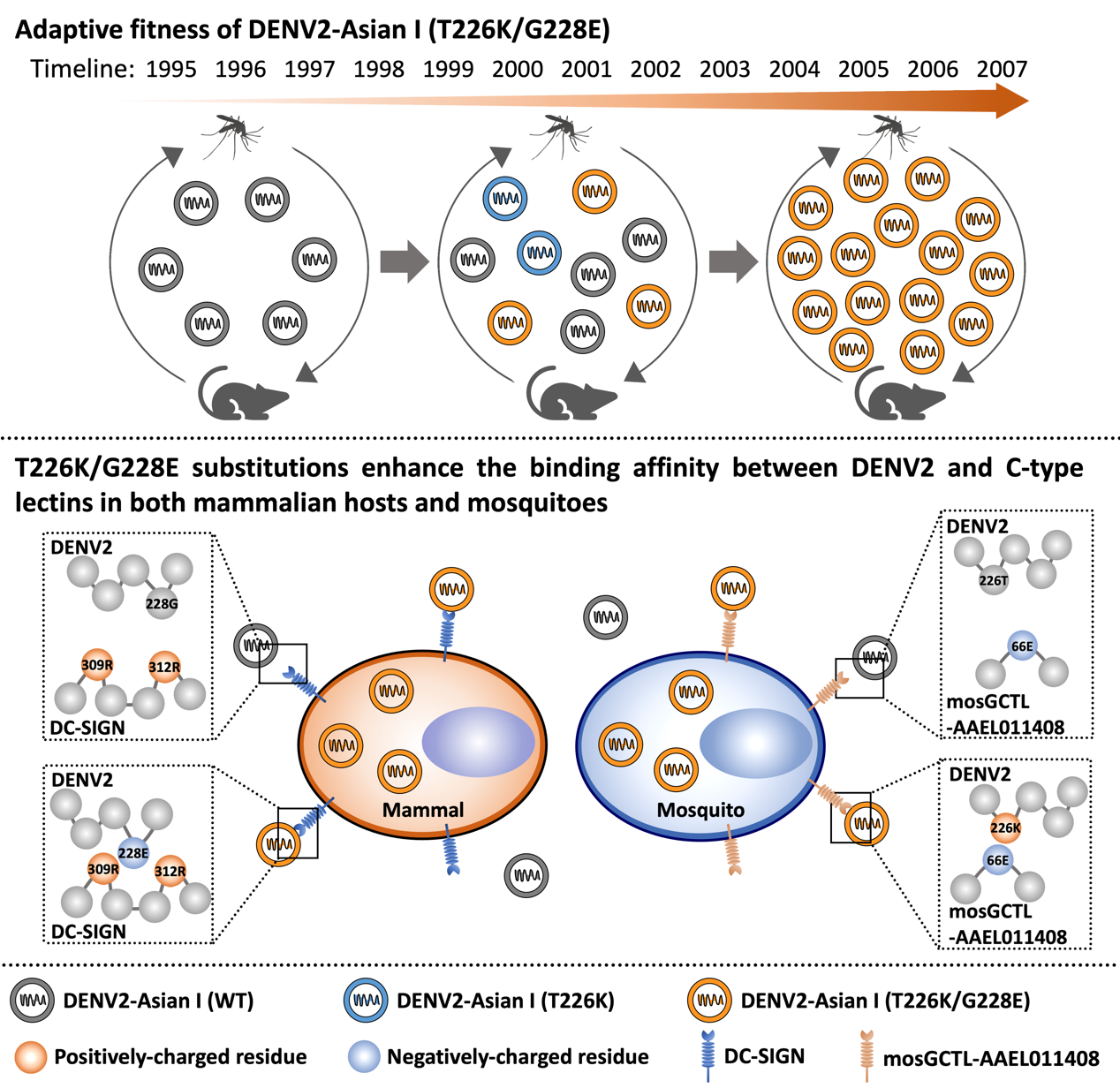 机制研究发现,T226K/G228E双突变病毒同时增强了登革病毒与哺乳动物和蚊虫上的C型凝集素(DC-SIGN和mosGCTL-AAEL011408)的结合。通过对包膜蛋白与C型凝集素结构的分子对接发现,第226位和第228位残基分别与mosGCTL-AAEL011408和DC-SIGN上的带电残基相邻。进一步的研究表明,第226位和第228位残基的带电性质调控了登革病毒与C型凝集素的结合能力,从而促进病毒进入细胞,使突变后的登革病毒对哺乳动物宿主和蚊虫的感染能力上升(图1)。