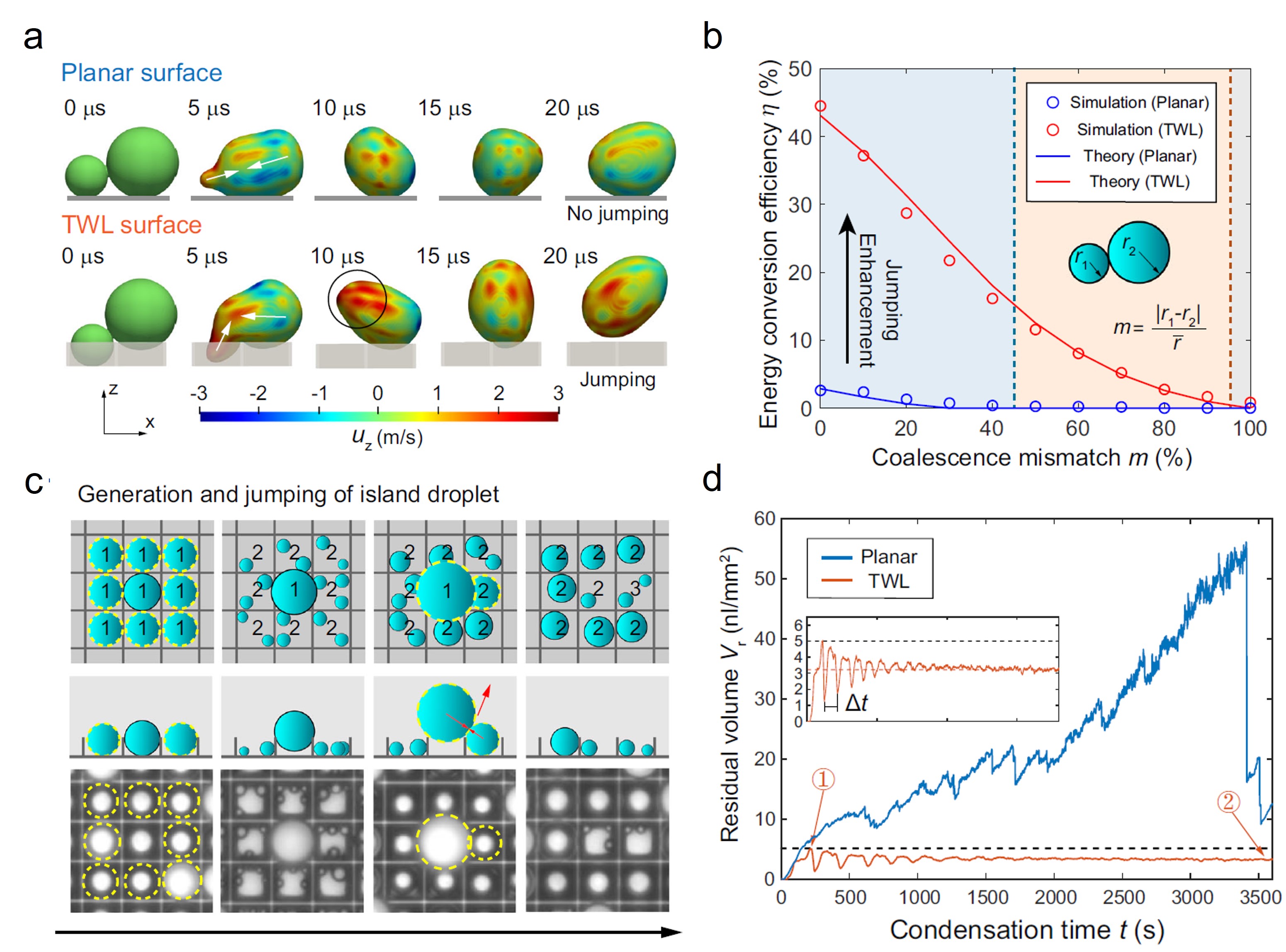 图2. 冷凝液滴筛的原理及液滴弹离效果:(a)相同大小液滴在平面及TWL表面的合并弹跳VOF模拟;(b)不同液滴失配度下的合并弹跳强化效应;(c)生长隔离效应促进“孤岛”液滴的脱离;(d)平面及TWL表面的残余液体体积随冷凝时间的变化