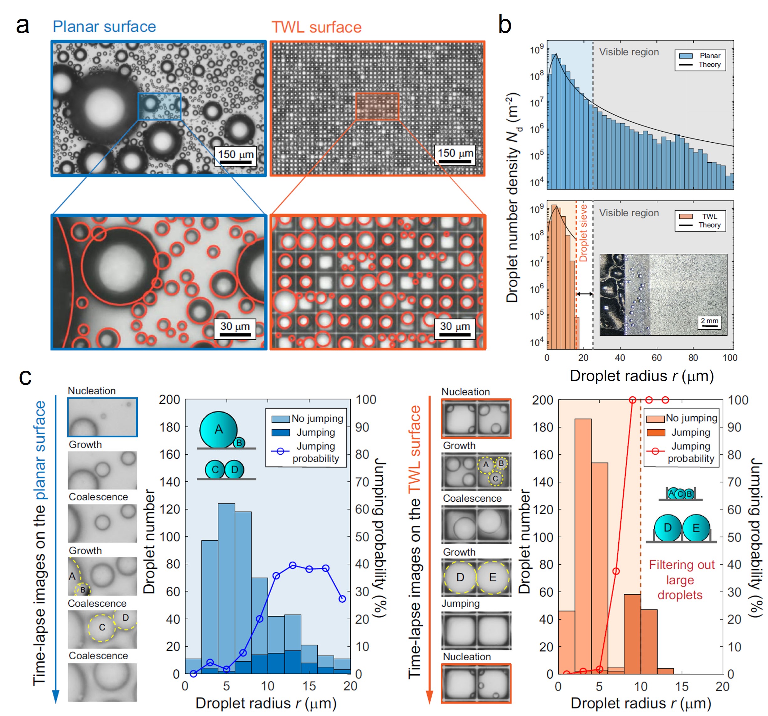 图1.冷凝液滴在超疏水平面及超疏水薄壁栅格表面的分布及演化:(a)平面及薄壁栅格表面的液滴冷凝分布;(b)冷凝液滴在平面及薄壁栅格表面的尺寸分布;(c)平面(左图)及薄壁栅格表面(右图)冷凝液滴的演化过程及合并弹跳概率