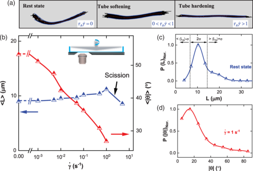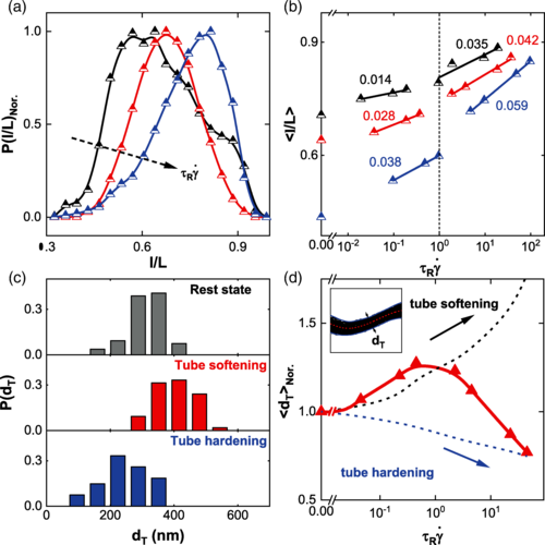 近日,乐竞首页航天航空学院曹炳阳教授和美国科学院院士、韩国基础科学院软物质及生命材料基础科学研究所史蒂夫·格拉尼克(Steve Granick)教授课题组合作在期刊《物理评论快报》(Physical Review Letters)上发表了题为“生物聚合物链缠结在剪切流场中先软化后硬化”(Biopolymer filament entanglement softens then hardens with shear)的论文。通过单分子荧光成像技术,直接观测到了单分子肌动蛋白在剪切流场中的定向排列与拉伸行为。随剪切速率的增加,聚合物分子链的管道先在定向排列的作用下“软化”,再在拉伸的作用下“硬化”。这表明聚合物的动态局域行为受到单分子链的定向排列与拉伸的共同影响。