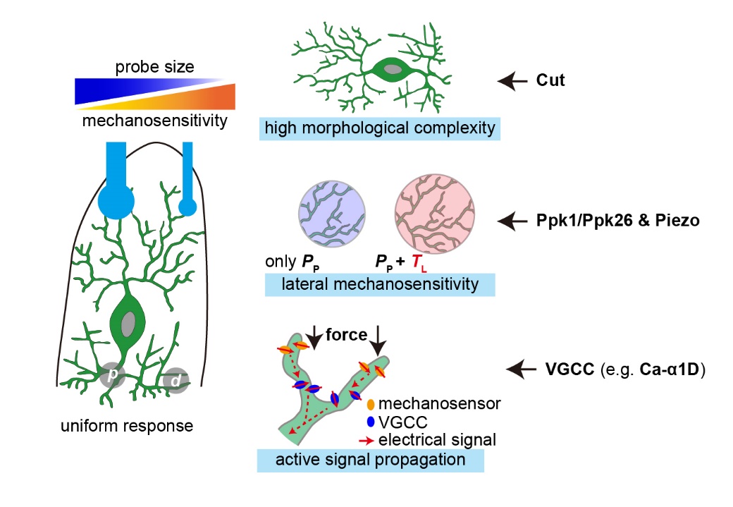 研究发现c4da神经元对毫牛级别的机械力刺激敏感,同时对压强分布范围较小的刺激表现出更高的敏感性,这一发现为理解c4da神经元参与感知果蝇幼虫天敌的袭击提供了细胞生物学基础。进一步的实验和力学模型分析发现c4da神经元通过优化自身的树突网络形态,发展对侧向组织张力的敏感性和树突内主动信号扩散等细胞生物学机制优化了其对机械痛觉刺激的感知(图3)。该项研究结合了生物物理和神经科学等诸多相关领域的研究方法和技术,其结果为进一步理解机械痛觉的形成机制提供了重要参考,也拓展了关于机械痛觉感受的细胞与分子通路的基础知识。