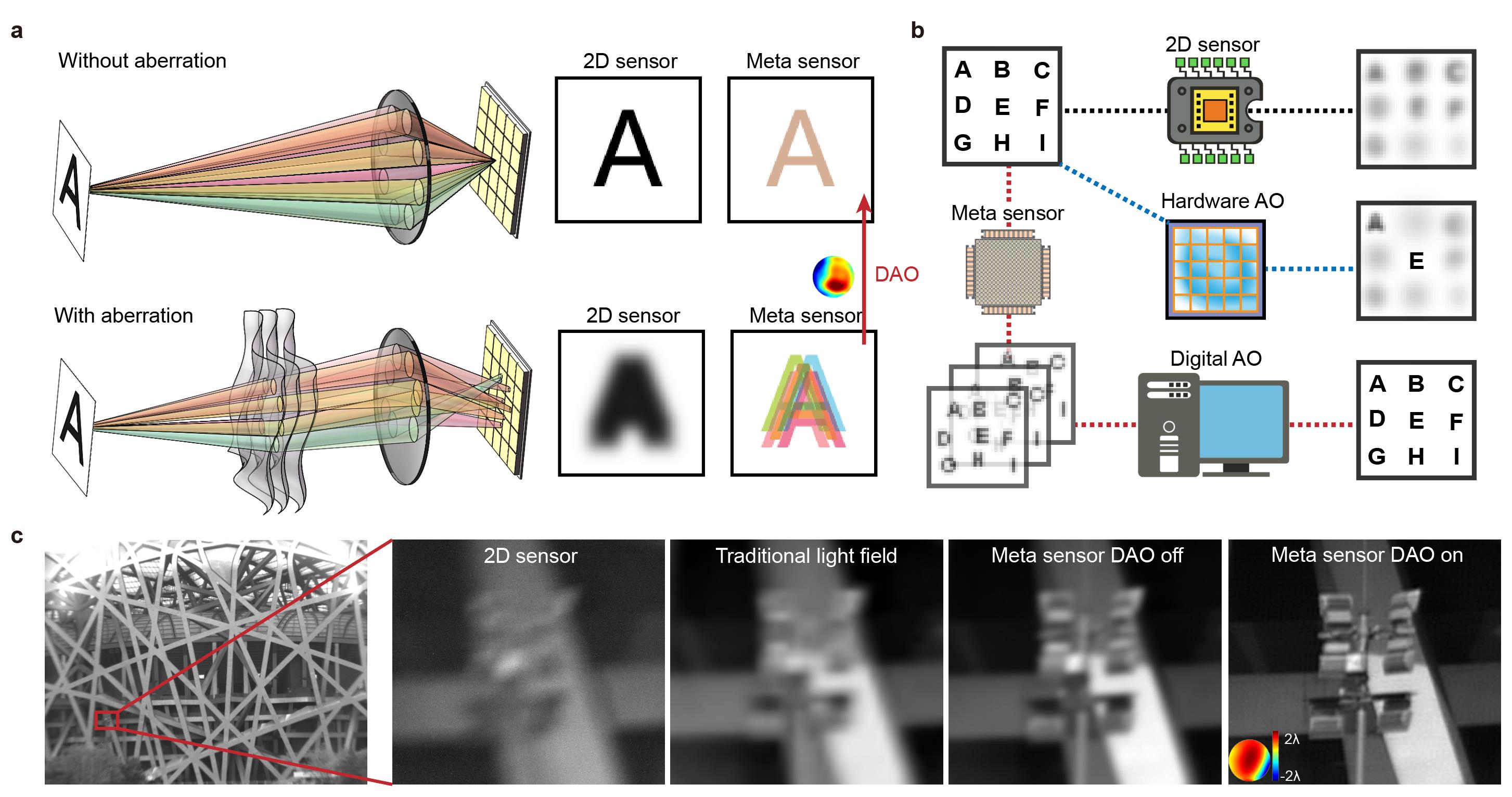 图1. 元成像芯片成像原理与大范围像差矫正效果(来源:《自然》)