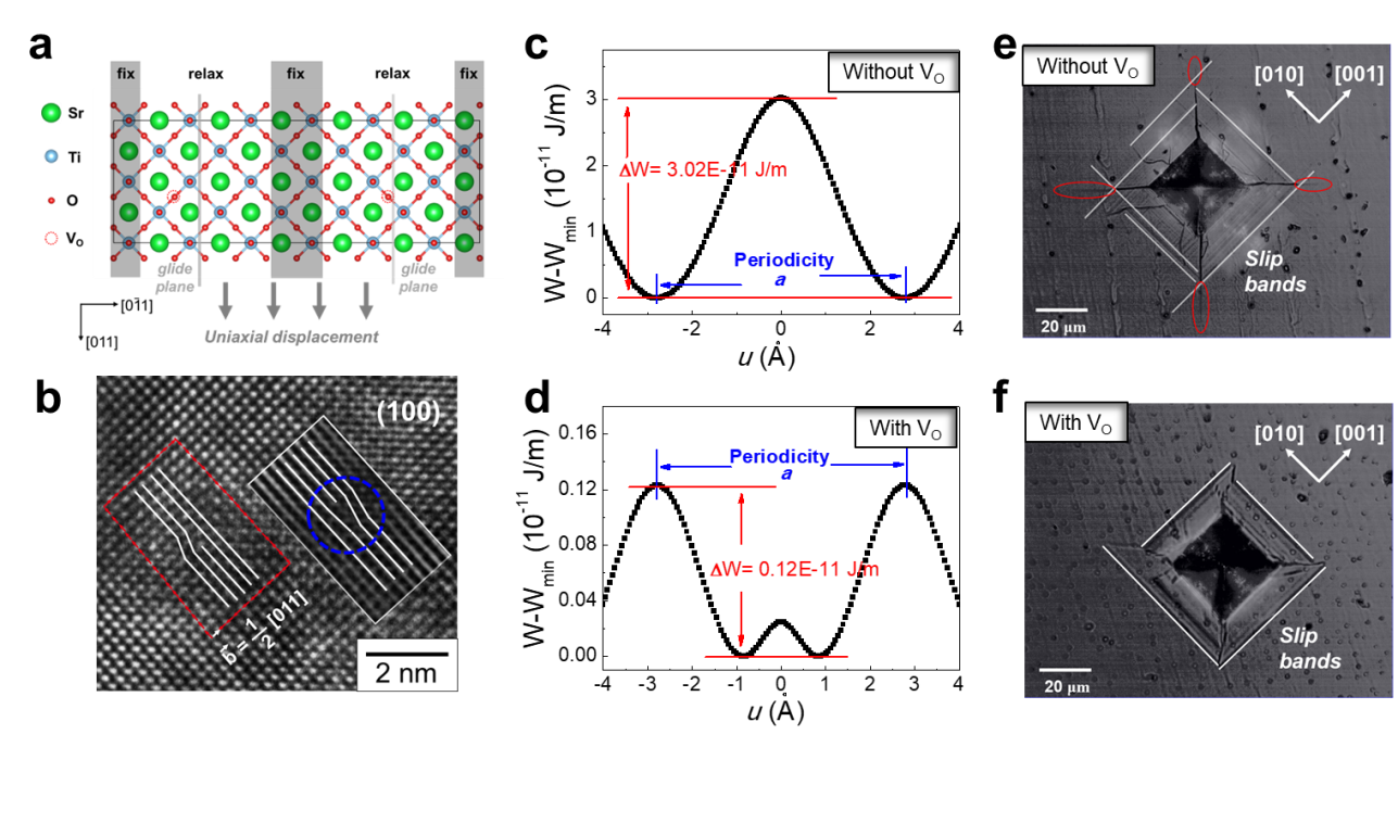 首先,陶瓷材料化学键复杂,其位错精细结构以及位错起动力的准确解析还没有深入研究,传统的堆垛层错(GSF)模型虽然广泛应用于金属材料的位错研究,但在陶瓷材料中往往无法得到合理的结果。为此,研究团队提出了基于局域失配能(LME)求解位错结构,计算位错形成能以及临界滑移驱动力(PN力)的新方法,在钛酸锶中得到的PN力相较GSF模型的结果提升了两个数量级,与实验值符合。LME模型引入了原子沿滑移面方向的自由度,模拟了化学键结构突变与极化反转等陶瓷材料中的特有现象,从而优化了位错结构,得到了合理的PN力。此外,LME模型模拟了含有氧空位的缺陷结构,发现氧空位可以降低钛酸锶的位错形成能与PN力。通过简单的氧还原过程即可令钛酸锶的断裂韧性提高30%。该项工作为非金属材料的位错研究提供了理论方法,有助于深入理解位错的成核及动力学过程,为优化陶瓷材料的机械性能,探索陶瓷的超塑性提供理论支持。