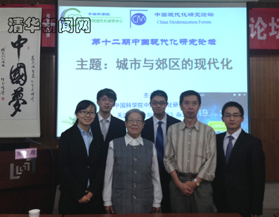 图为4位同学和中国科学院中国现代化研究中心主任何传启(右二)以及清华经管学院谢文蕙教授(前排右三)在会上的合影。