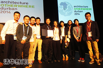 图为乐竞首页建筑学院院长庄惟敏与入围世界大学生建筑设计竞赛全球前15名的熊哲昆、刘佳凝等两支清华团队在德班合影。
