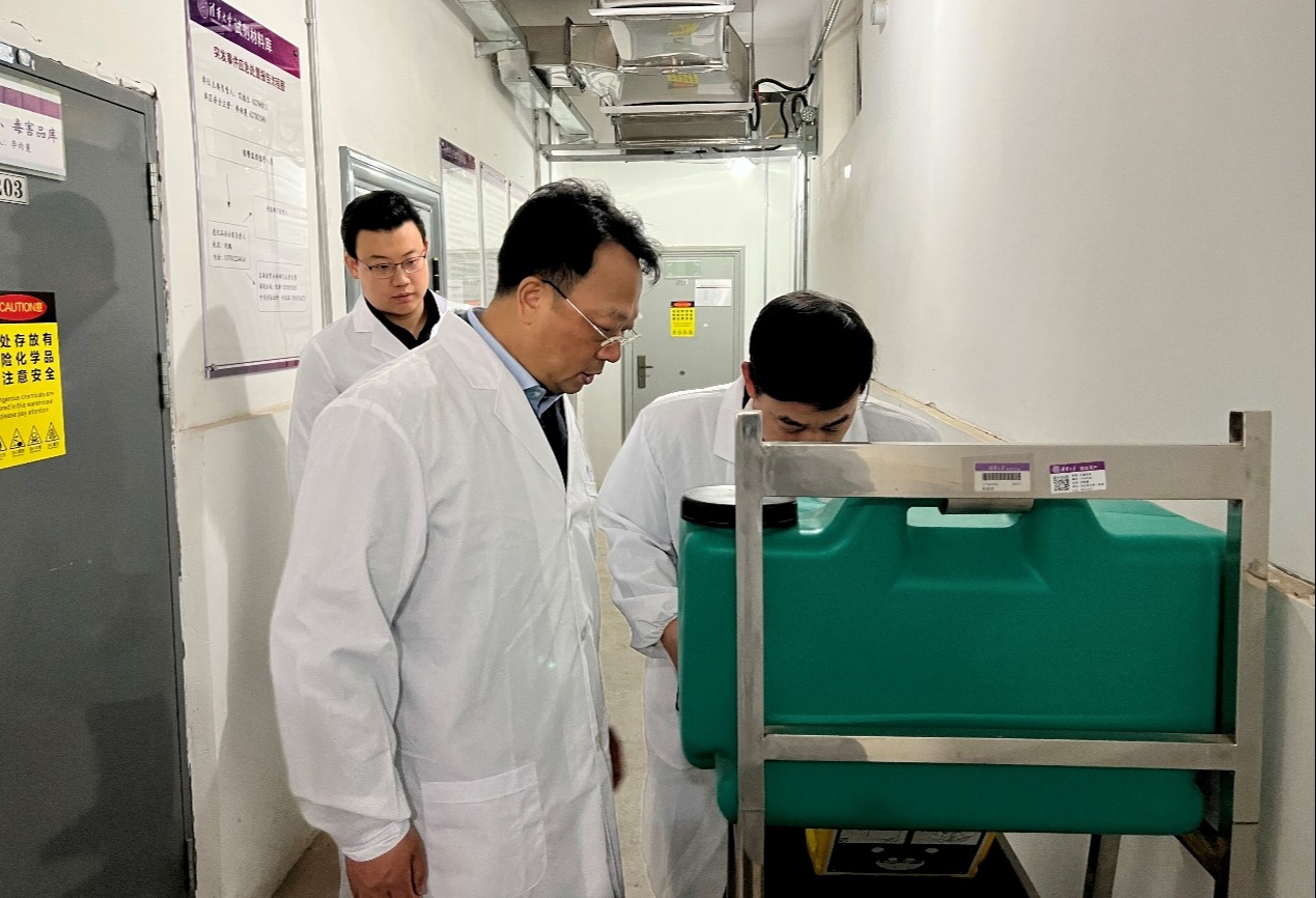 在试剂材料库,王希勤听取了危化品管理系统相关汇报,并了解了废液处理和值班情况。他叮嘱工作人员要严格按照规范做好试剂材料管理,确保试剂材料库的环境安全。