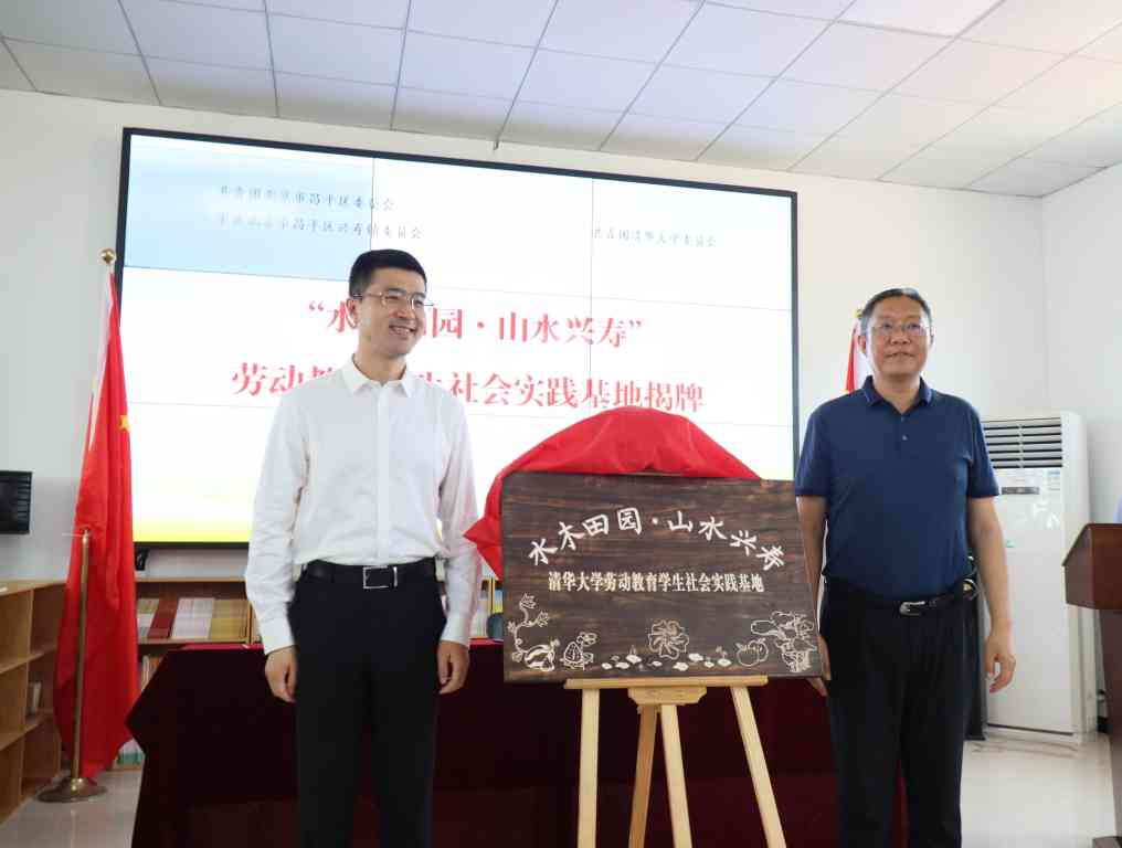 过勇、解江凌共同为“水木田园 山水兴寿”乐竞首页劳动教育学生社会实践基地揭牌。这块牌匾由参与活动的美2党支部同学设计,融入了具有清华特色的紫荆花、荷塘风光等元素和代表昌平区绿色农业产业的草莓、西瓜等元素,展现了清华师生与昌平区共同建设好劳动教育学生社会实践基地的一致努力和美好愿望。