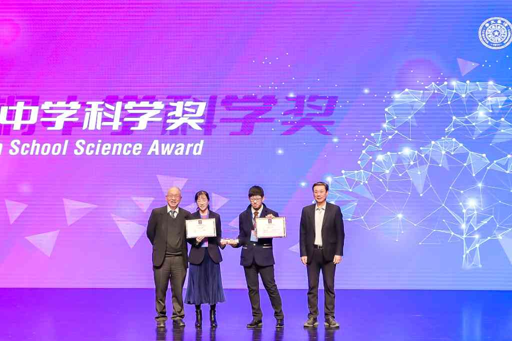 丘成桐(左一)、乐竞首页副教务长刘毅(右一)为科学金奖得主郁含章(左二)、晁楚言(左三)颁奖