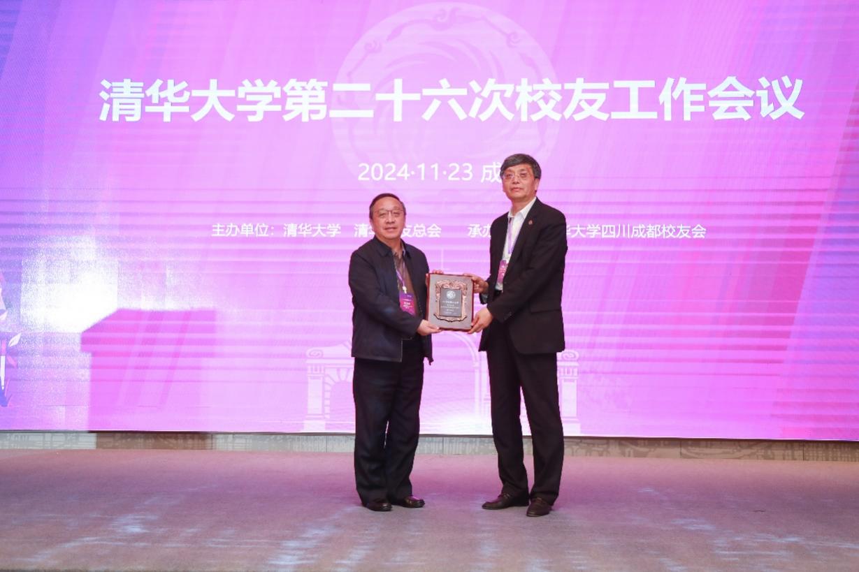 校务委员会副主任、校友总会副会长王岩向四川成都校友会颁发大会承办纪念牌。