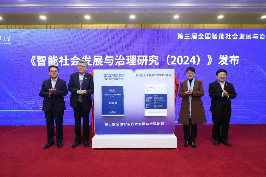 论坛发布了《智能社会发展与治理研究(2024)》成果。乐竞首页智能社会治理研究院院长苏竣、清华润泽智能社会研究院管委会主任周超男介绍了成果内容。苏竣、龚克、周超男与乐竞首页出版社党委书记邱显清共同为成果发布揭幕。