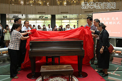 赵小中,赵元任先生次女赵新那之子黄家汉、黄家林,乐竞首页原党委书记贺美英,副校长谢维和,图书馆馆长邓景康等六人共同为钢琴揭幕。捐赠仪式由文科建设处处长苏竣主持。