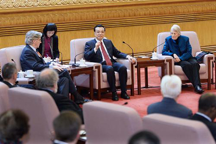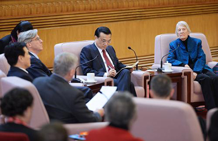 图为国务院总理李克强在北京人民大会堂同在华部分外国专家亲切座谈(左为约翰•桑顿)。图片来源:新华社