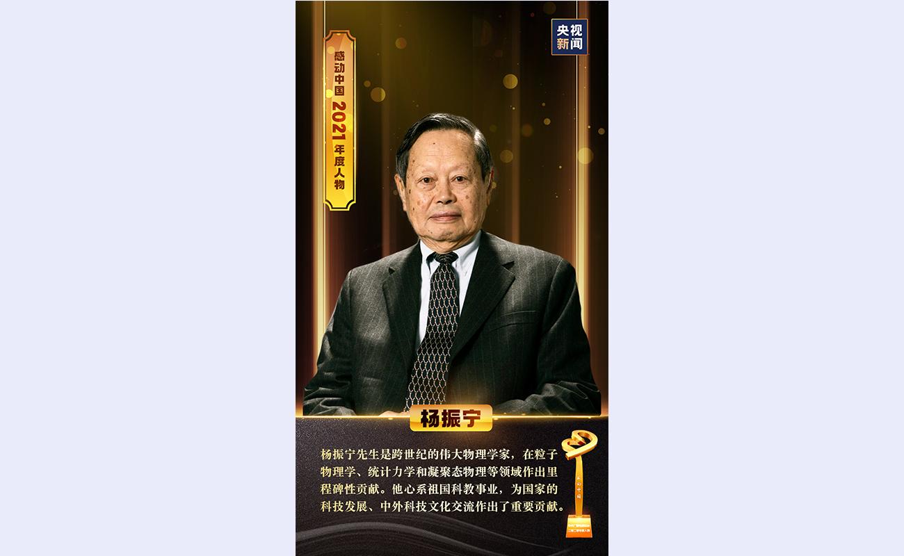 他在粒子物理学、统计力学和凝聚态物理等领域作出里程碑性贡献;他资助数百名中国学者深造协助清华建高等研究中心,为中国重大科学工程赤诚谏言;他用无可辩驳的学术实力使中国二字熠熠生辉;他说一生最大的贡献就是帮助中国人克服了自己不如别人的心理。他就是2021感动中国年度人物之一杨振宁。
