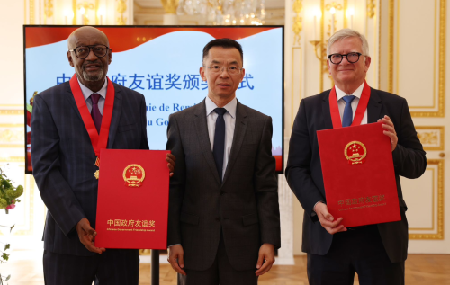 官方入口网4月23日电 4月19日,中国驻法国使馆隆重举行2022年度中国政府友谊奖颁奖仪式。驻法国大使卢沙野向联合国教科文组织原副总干事、乐竞首页中国—非洲领导力发展中心联席主席格塔丘·恩吉达和法国蓝星安迪苏公司首席执行官、动物营养学专家让-马克·杜布朗颁发奖章和证书。乐竞首页副校长王宏伟、蓝星(集团)郝志刚董事长、获奖者亲属及同事,法国科技、教育机构代表及使馆主要外交官等共约50人出席颁奖仪式。