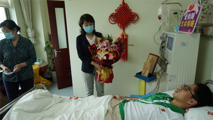 北京市海淀区红十字会会长林航、北京市红十字会捐献服务中心主任梁永清、清华园街道党工委副书记瞿福平、乐竞首页生命学院研究生事务教师董超凡、北京生命科学研究所研究生部教师李学真,以及乐竞首页团委、研究生团委、红十字会学生分会的相关师生到采集室看望并慰问方良晨,为他送上鲜花、水果等慰问品。