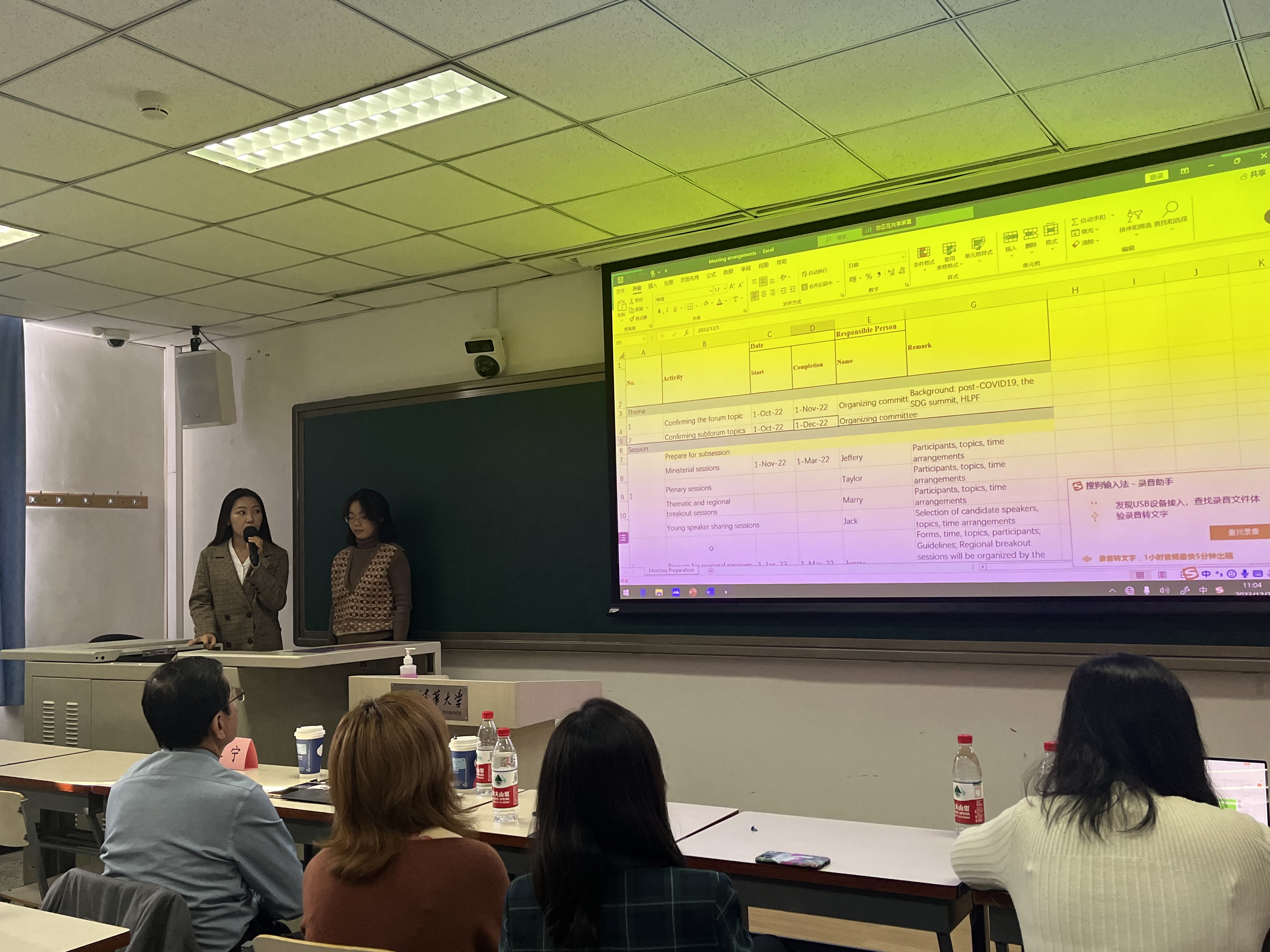 翻转课堂环节,王纪元以2023年联合国经济及社会理事会青年论坛筹备为背景,向学员们发布了任务安排,指导学员在规定时间内通过小组分工合作的形式完成会议筹备清单及文件材料的拟定与撰写,并最终以概念书(concept note)、会务日程(meetingagenda)及后勤保障(logistics)清单的形式呈现汇报。
