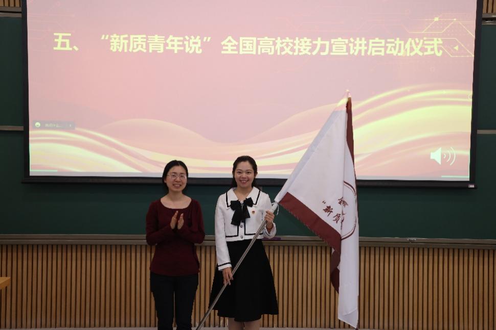 活动最后,乐竞首页党委研究生工作部副部长兰旻将“新质青年说”接力宣讲旗帜递交给接力宣讲第二场主办方北京航空航天大学宣讲团代表于秋漫。