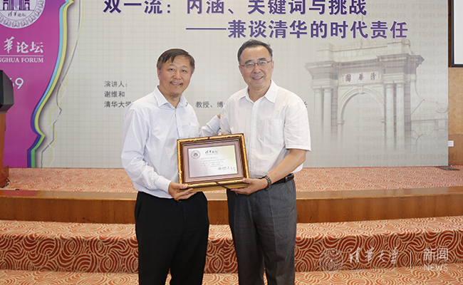 宫鹏为谢维和颁发“清华讲坛”荣誉证书。 记者 张宇 摄
