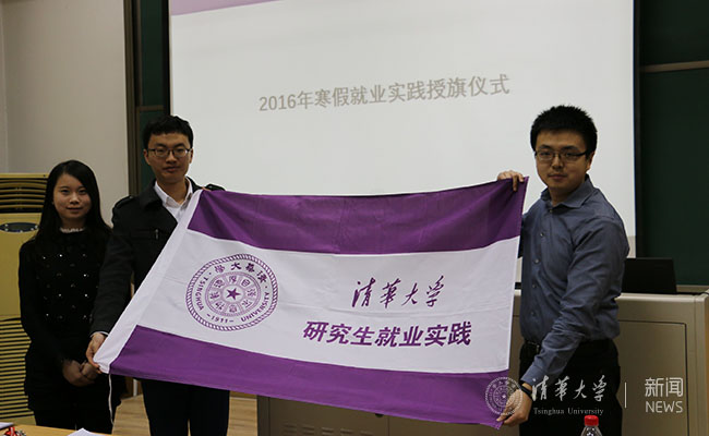最后,校研团委书记刘博涵为寒假就业实践支队长代表授旗。他鼓励研究生在就业实践中认识国情,深入了解行业现状,发现并尝试解决问题。另外,刘博涵还希望同学们具有责任与担当,时刻记住自己是一个清华人。