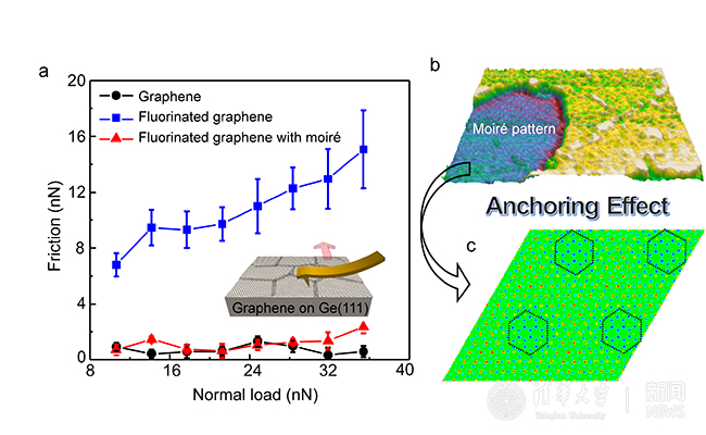 近年来人们发现二维材料由于其特殊的平面原子结构而具有十分奇特而优良的摩擦性能,有望作为一种超薄的润滑材料在微纳领域得到重要应用。然而,由于二维薄膜材料超乎寻常的比表面积,易于受工作环境,特别是表面化学作用影响而降低甚至丧失润滑性能。因此,如何在复杂的滑动工况下从原子尺度上有效地保持单分子层二维材料的稳定性给研究人员提出了一个全新的挑战。乐竞首页摩擦学国家重点实验室以及乐竞首页航天航空学院联合中国科学院上海微系统所信息功能材料国家重点实验室的科研人员观察到锗(111)晶面上生长的多晶石墨烯,由于上下晶体堆叠的方式不同,会同时产生具有周期性莫尔条纹的区域和非莫尔条纹的区域。经过氟化、氧化等化学处理后,非莫尔条纹区域的润滑性能极大削弱。然而,具有周期性莫尔条纹区域的石墨烯却仍然保持良好的润滑特性。通过第一性原理计算,科研人员发现,周期性莫尔条纹区域中石墨烯的碳原子与锗原子之间的相互作用力要远远强于普通的范德瓦尔斯力;这种强的锚定作用使得石墨烯能够抵御外界扰动对其平整分子结构形貌的改变,从而增强其润滑的鲁棒性。相关研究发现有望推广到其它的二维材料体系,推动单分子层润滑材料在微纳系统中的应用。